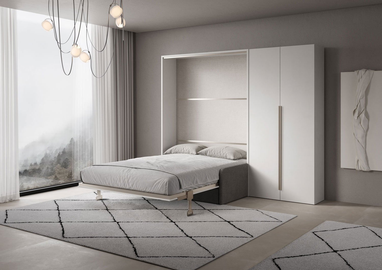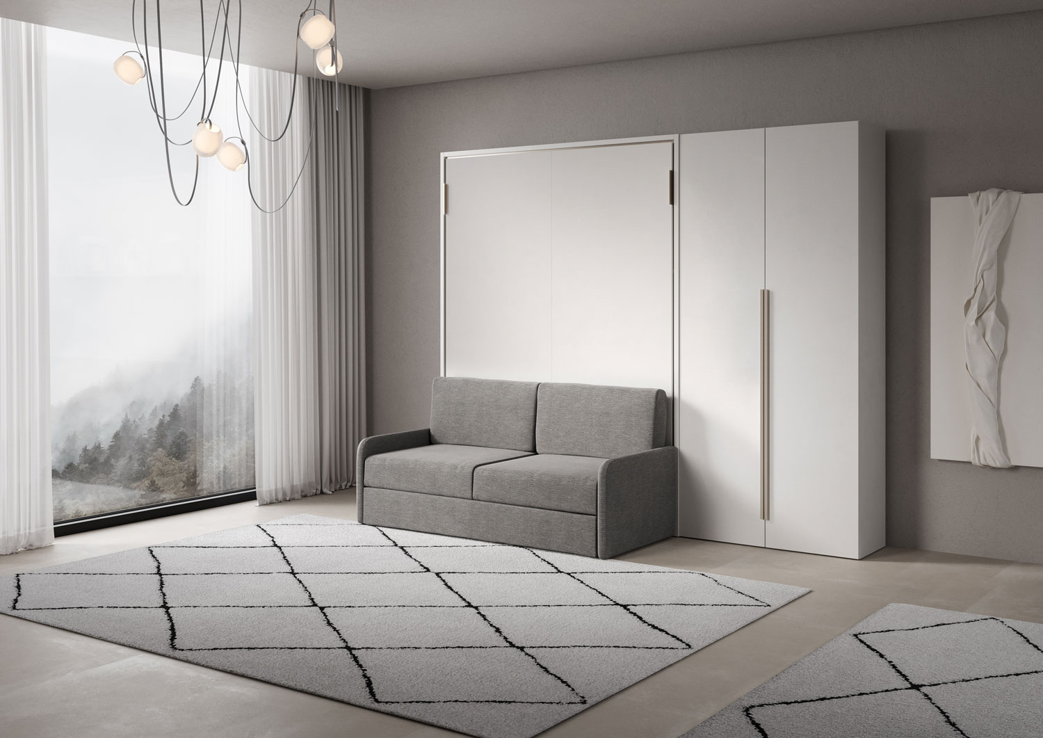 140 cm französisches Klappdoppelbett, vertikal, Versia Sofà, mit Sofa und 2-türigem Kleiderschrank rechts, Clay