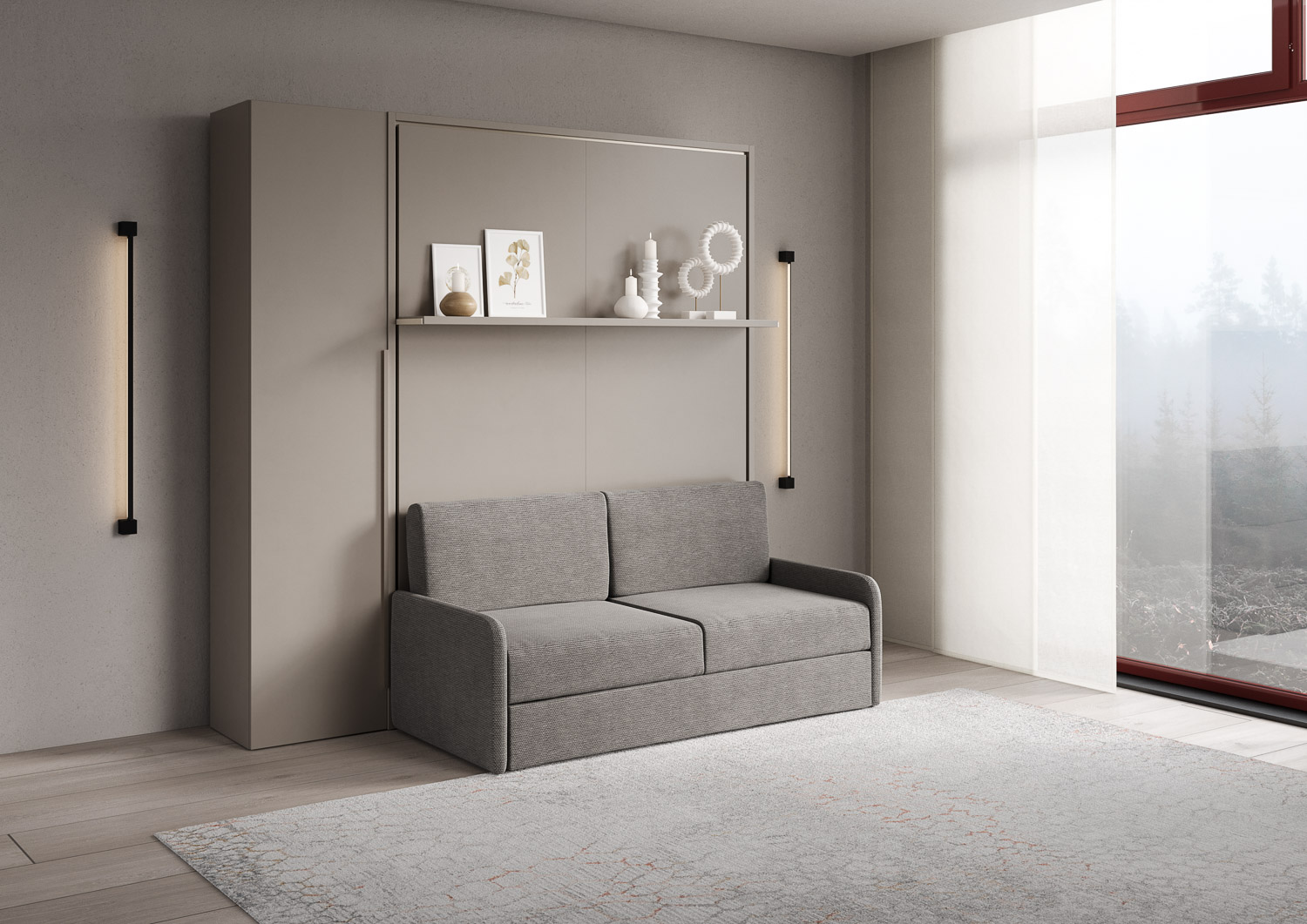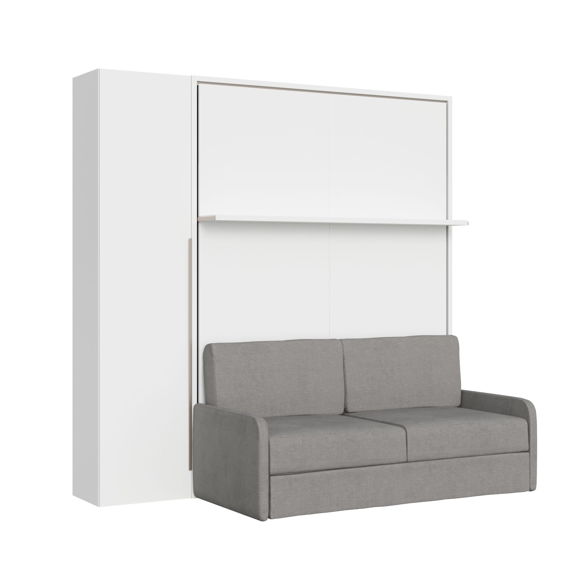 140 cm französisches Klappdoppelbett, vertikales Versia Sofà mit Sofa, Regal und 1-türigem Kleiderschrank links, Clay