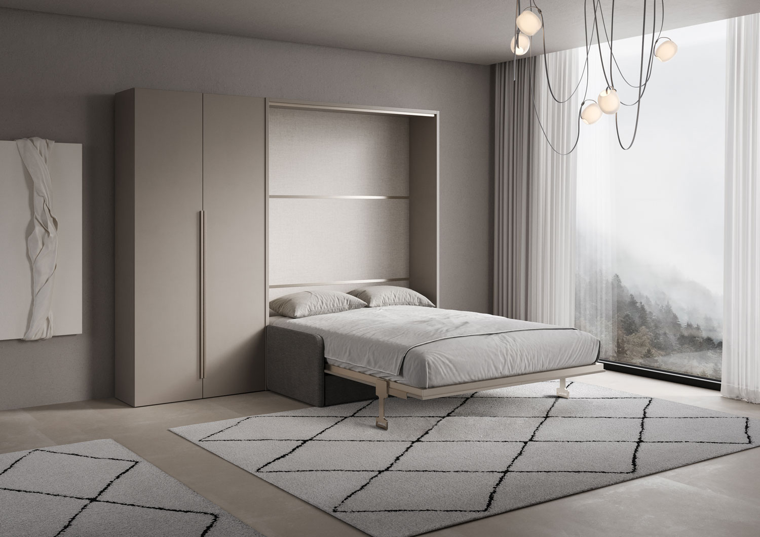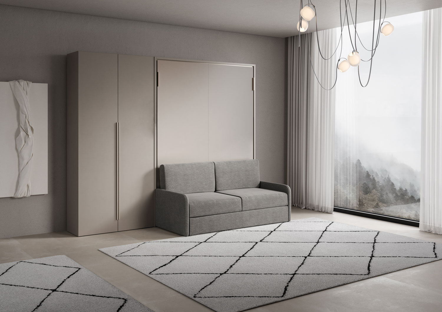 140cm französisches Klappdoppelbett, vertikal, Versia Sofà, mit Sofa und 2-türigem Kleiderschrank, links, Clay