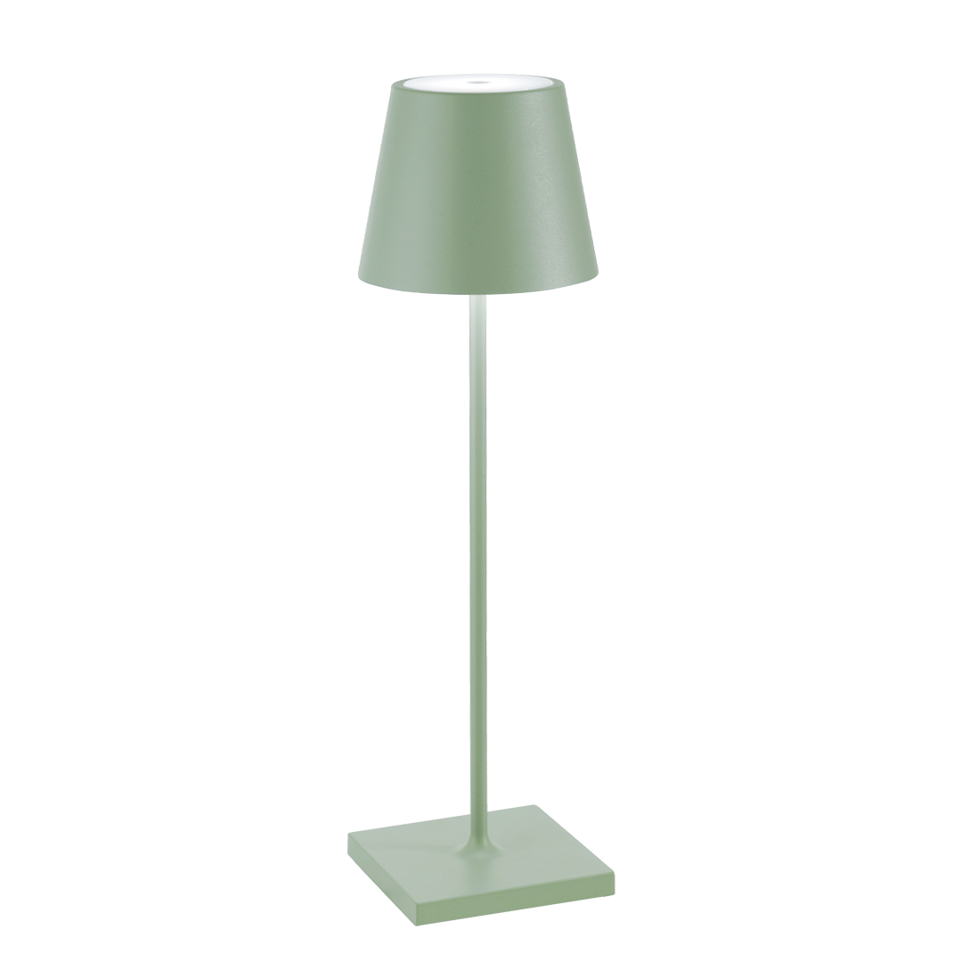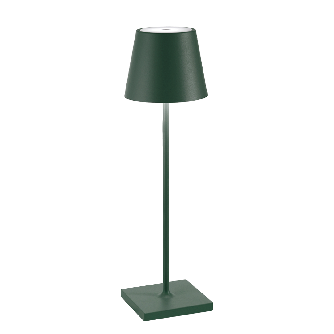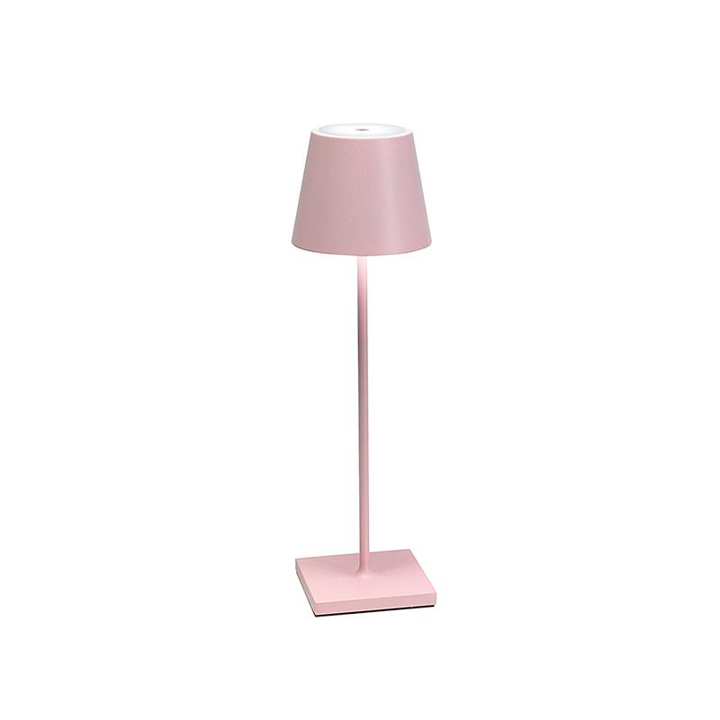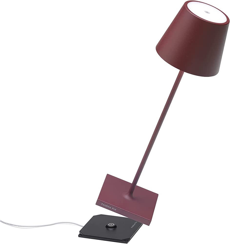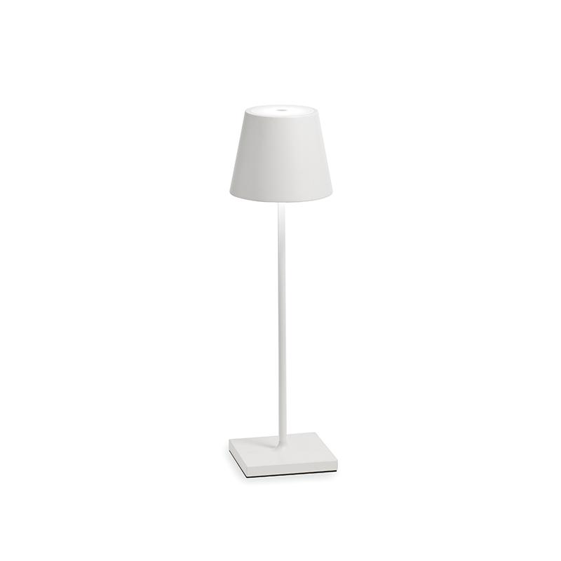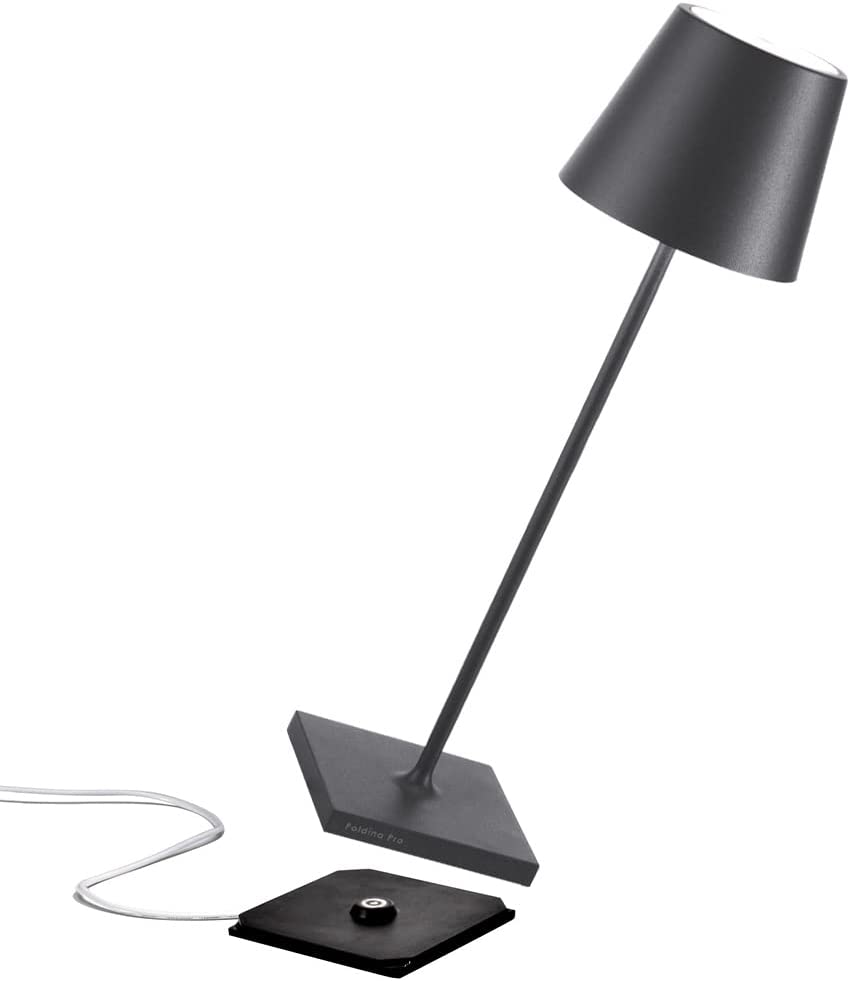 Wiederaufladbare Tischleuchte mit Kontaktladestation, lackiertem Aluminiumgehäuse, Polycarbonat-Diffusor und LED-Lichtquelle.