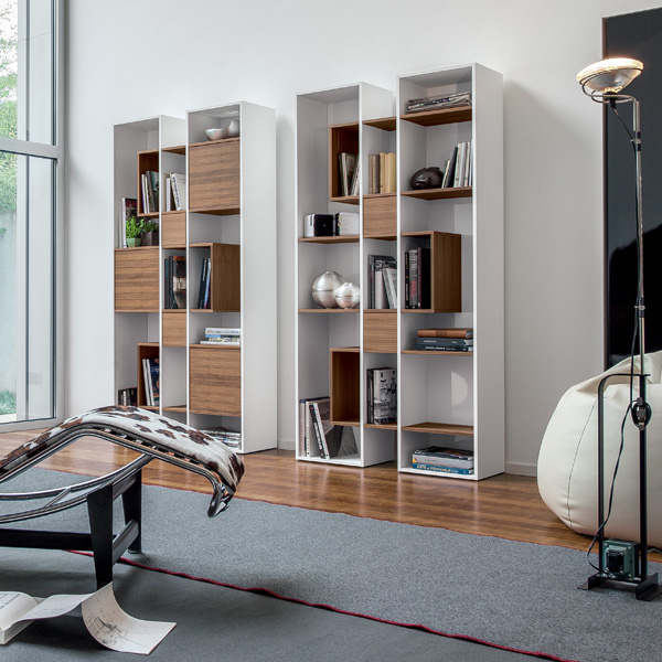 Bücherregal aus lackiertem Holz mit horizontalen Elementen, lackiert oder mit Holz bezogen. Optionale Schubladen und Holztüren.