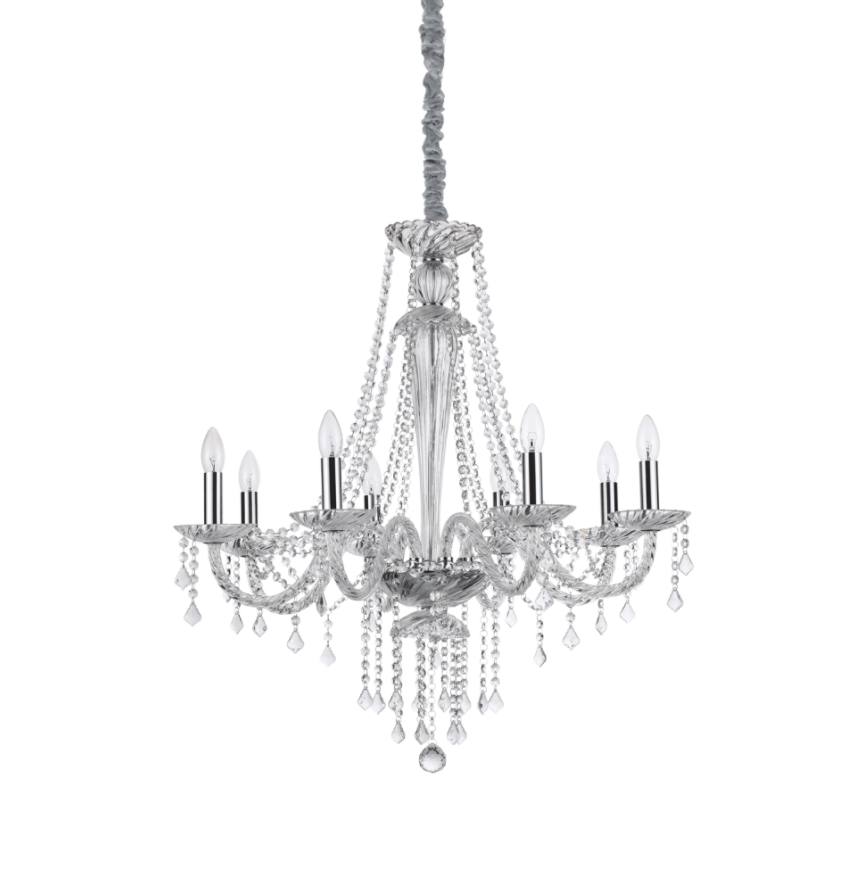 Rahmen aus verchromtem Metall. Dekorative Elemente aus mundgeblasenem Glas und geschliffenem Kristall. Samtkettenbezug.