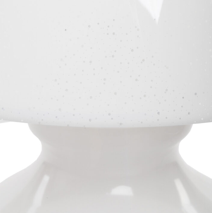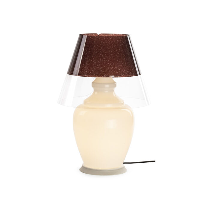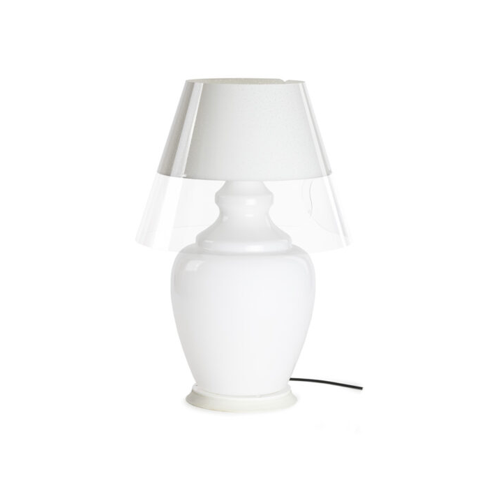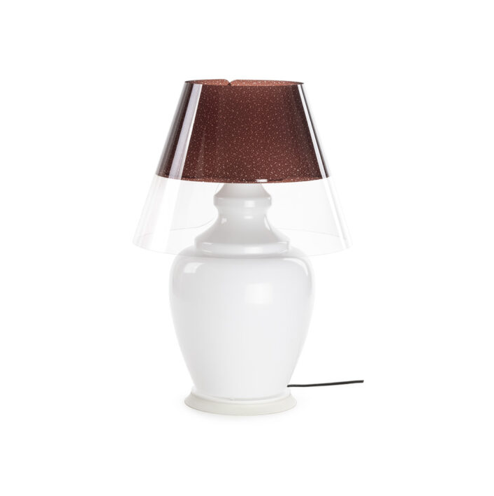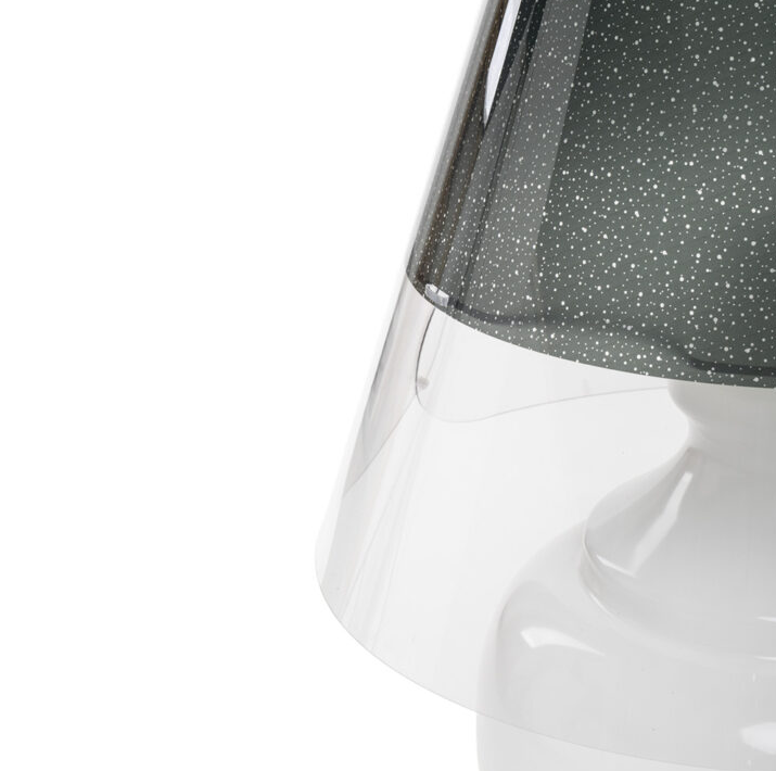 Diese Lampe wird mit Stolz in Italien hergestellt und besteht aus vollständig recycelbaren Kunststoffmaterialien: Der Korpus besteht aus opalem Acrylkristall, während der dekorative Lampenschirm aus transparentem Polycarbonat besteht und in den Varianten Grau, Weiß und Braun erhältlich ist.