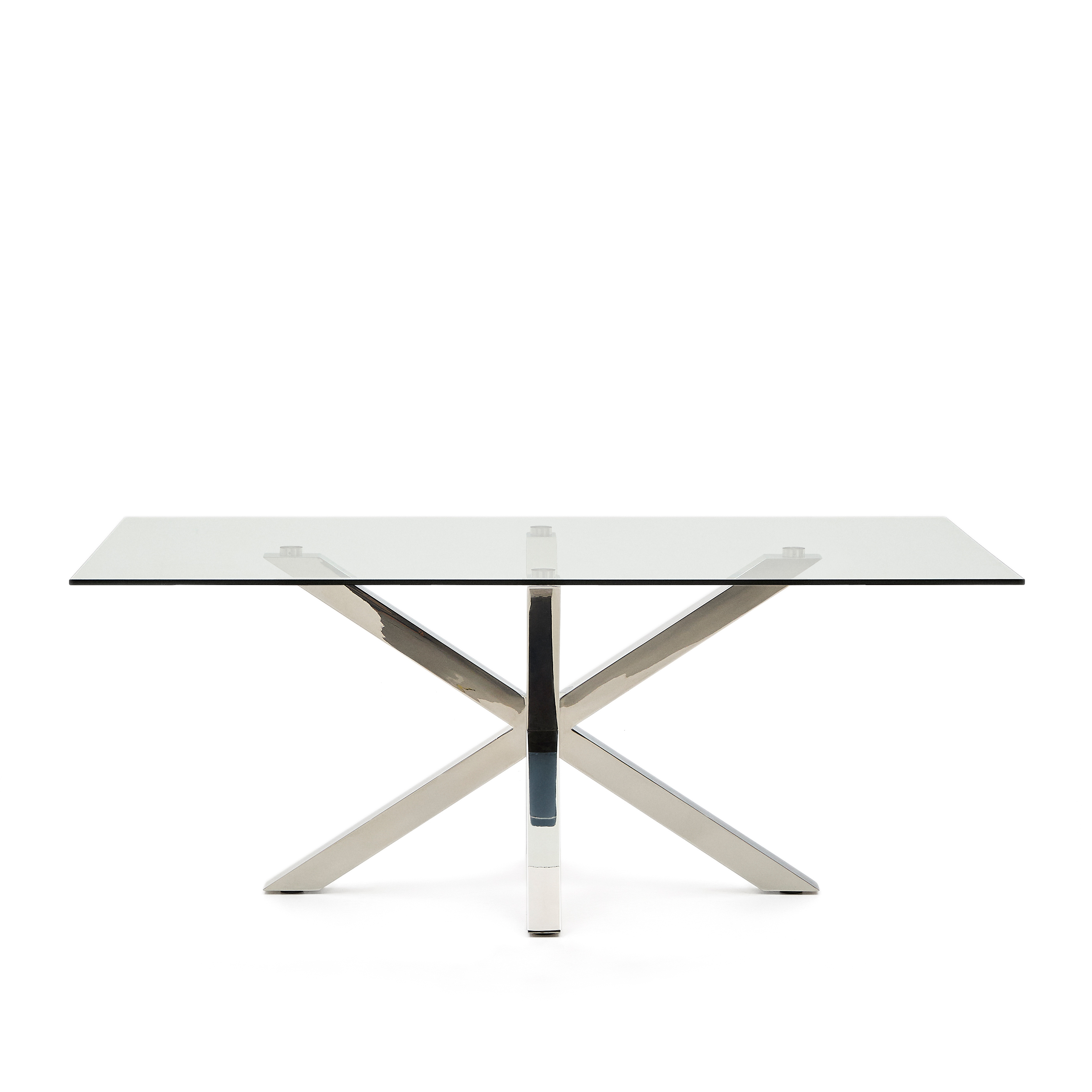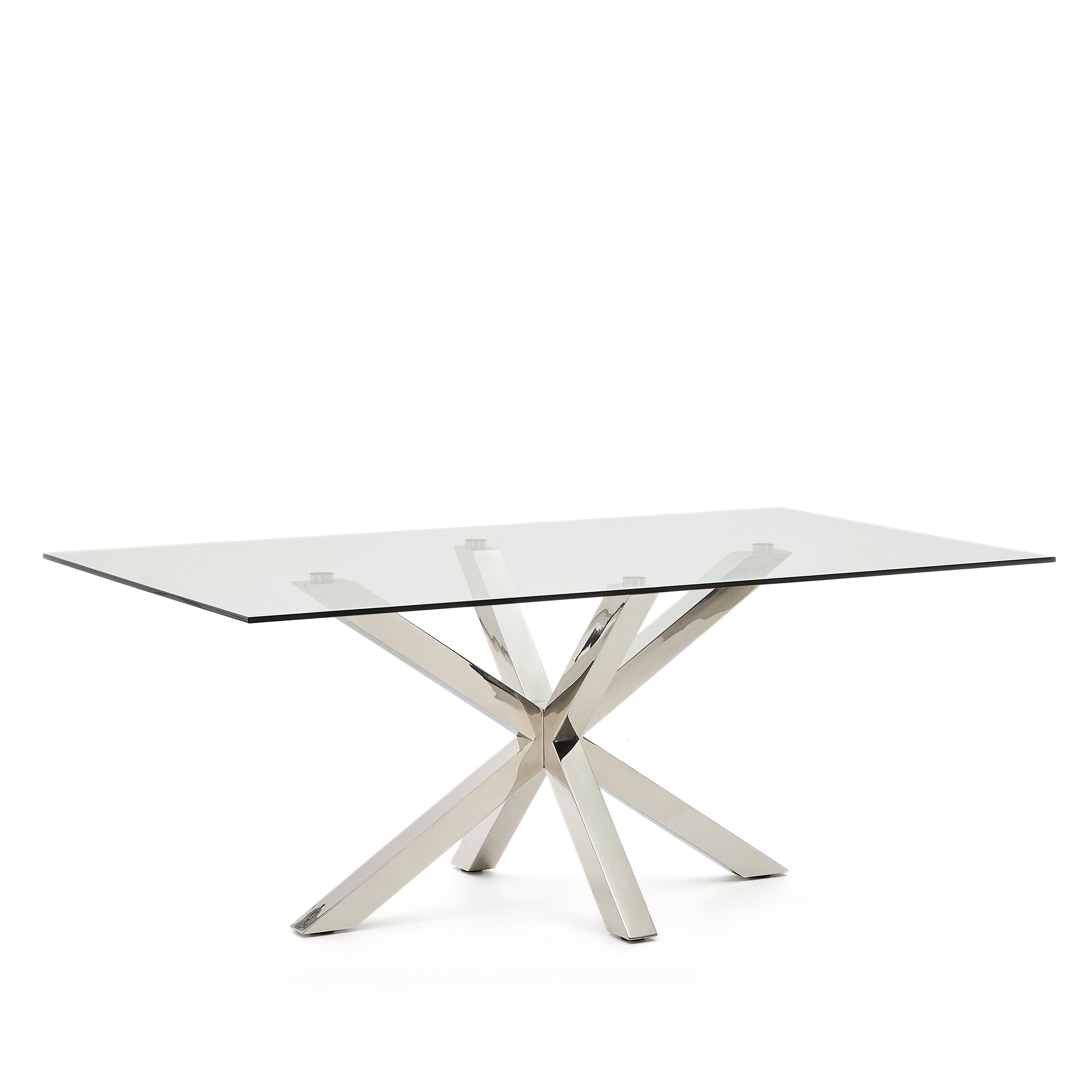 Tisch mit Stahlbeinen in Naturholzoptik. Tischplatte aus gehärtetem Glas.