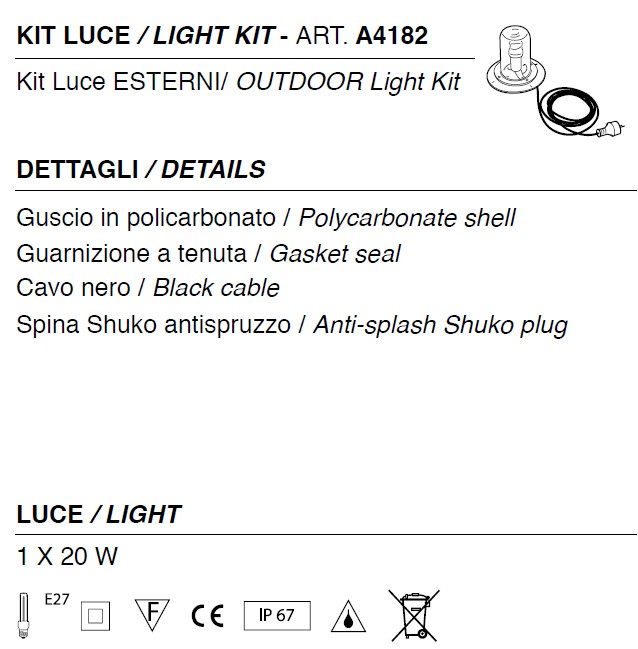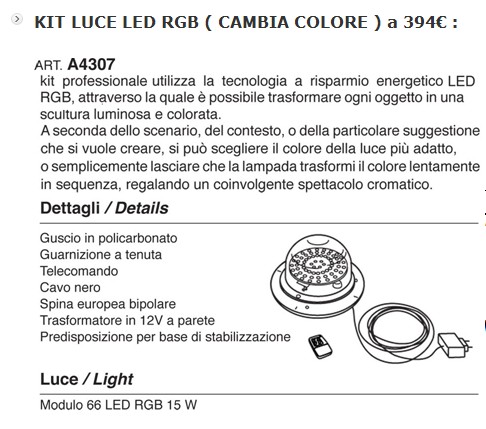 Es ist möglich, das Produkt mit dem Außenlicht-Kit oder dem RGB-Licht-Kit auszustatten. Bei letzteren werden dank des variablen Farbbereichs chromatische Effekte mit starker emotionaler Wirkung erzielt. (KIT LIGHTS, DIE SEPARAT GEKAUFT WERDEN, SIEHE CODES A4182 UND A4307)