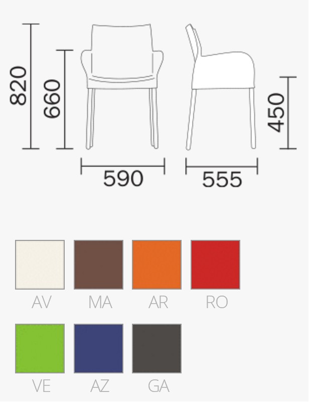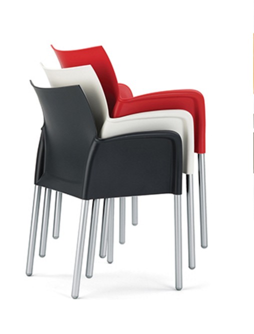 Stapelbarer Sessel mit Polypropylenschale und Beinen aus eloxiertem Aluminiumrohr mit einem Durchmesser von 28 mm. Bequem, umhüllend und mit nüchternem Design in verschiedenen Farben erhältlich. Es kann sowohl drinnen als auch draußen verwendet werden.