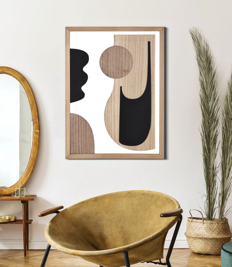 3D-dekoratives Wandpaneel aus Holz, bestehend aus abstrakten geometrischen Figuren. Die warmen Töne passen perfekt zu jeder Art von Möbeln.