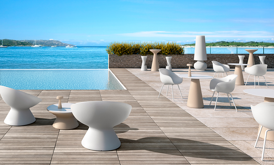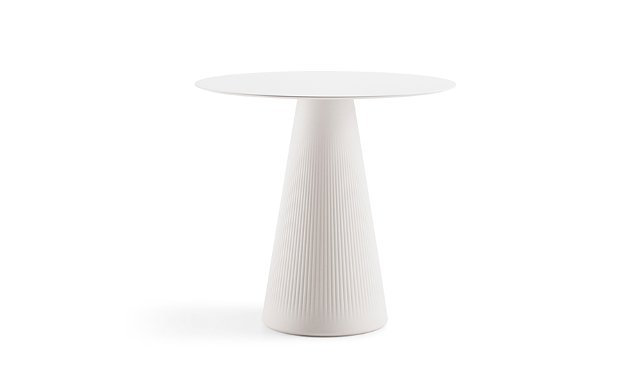 Tisch mit einem einzelnen Bein und geometrischem Volumen, modular mit HPL-Platte in runder und quadratischer Ausführung. Dank der gestreiften Oberfläche entstehen suggestive Schattenspiele. In der Ausführung „Weißlicht“ leuchtet der Tisch, und das von den Oberflächen gestreute Licht schafft eine magische Atmosphäre.