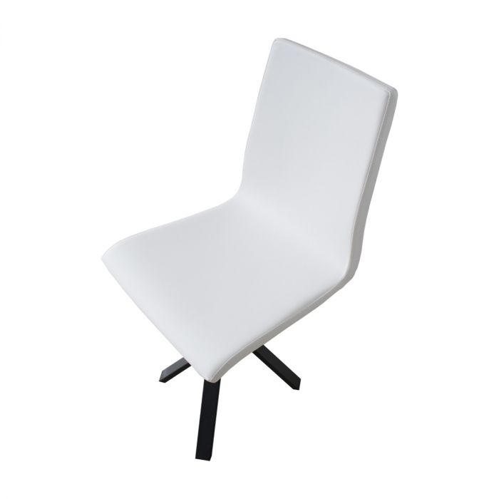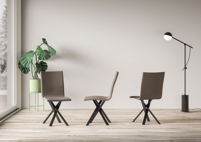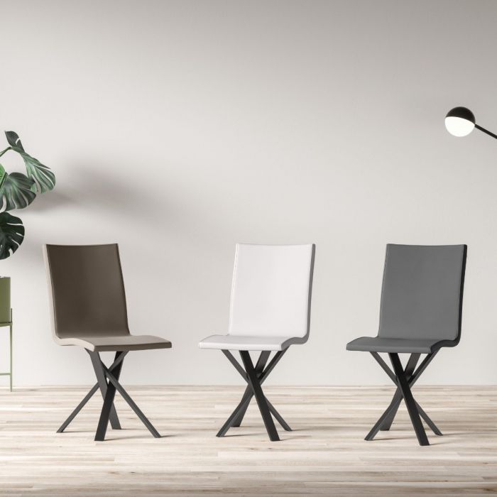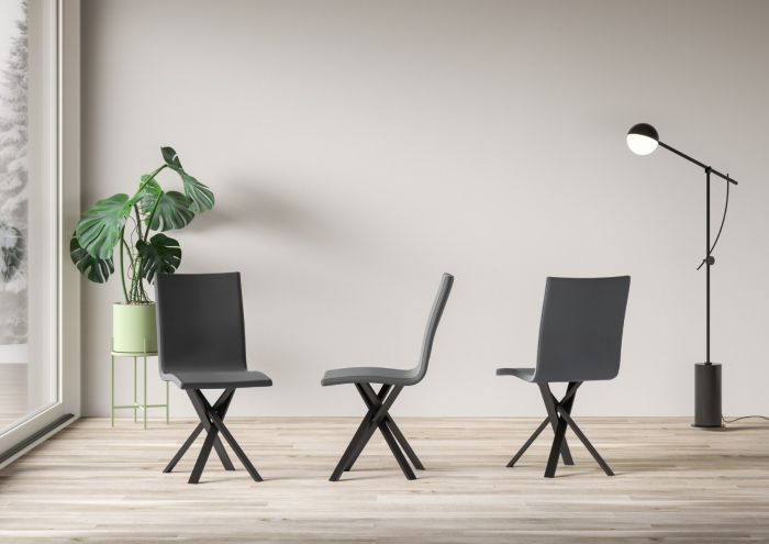 Aury Soft Stuhl mit anthrazitfarben lackierten Metallbeinen und einer leicht gepolsterten Holzschale mit Kunstlederbezug. Dieser Stuhl hat keine Armlehnen.