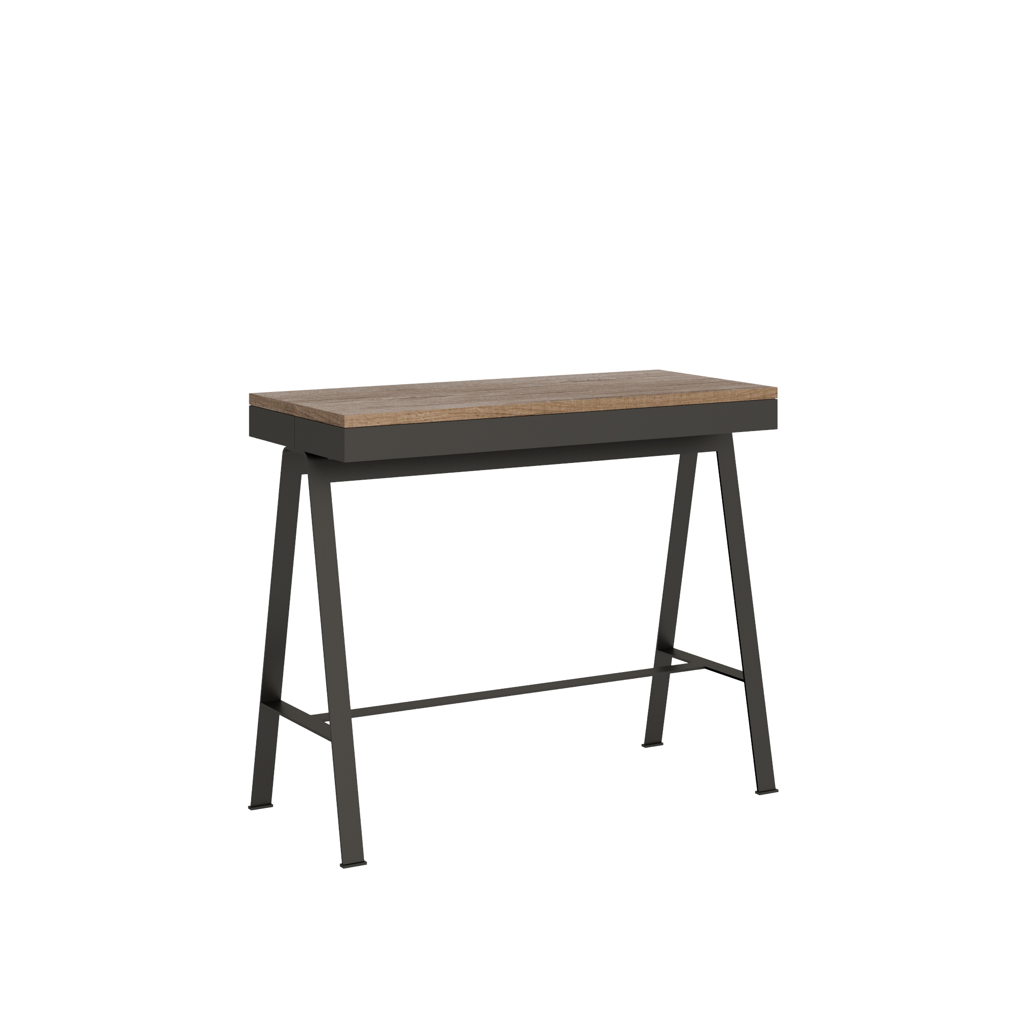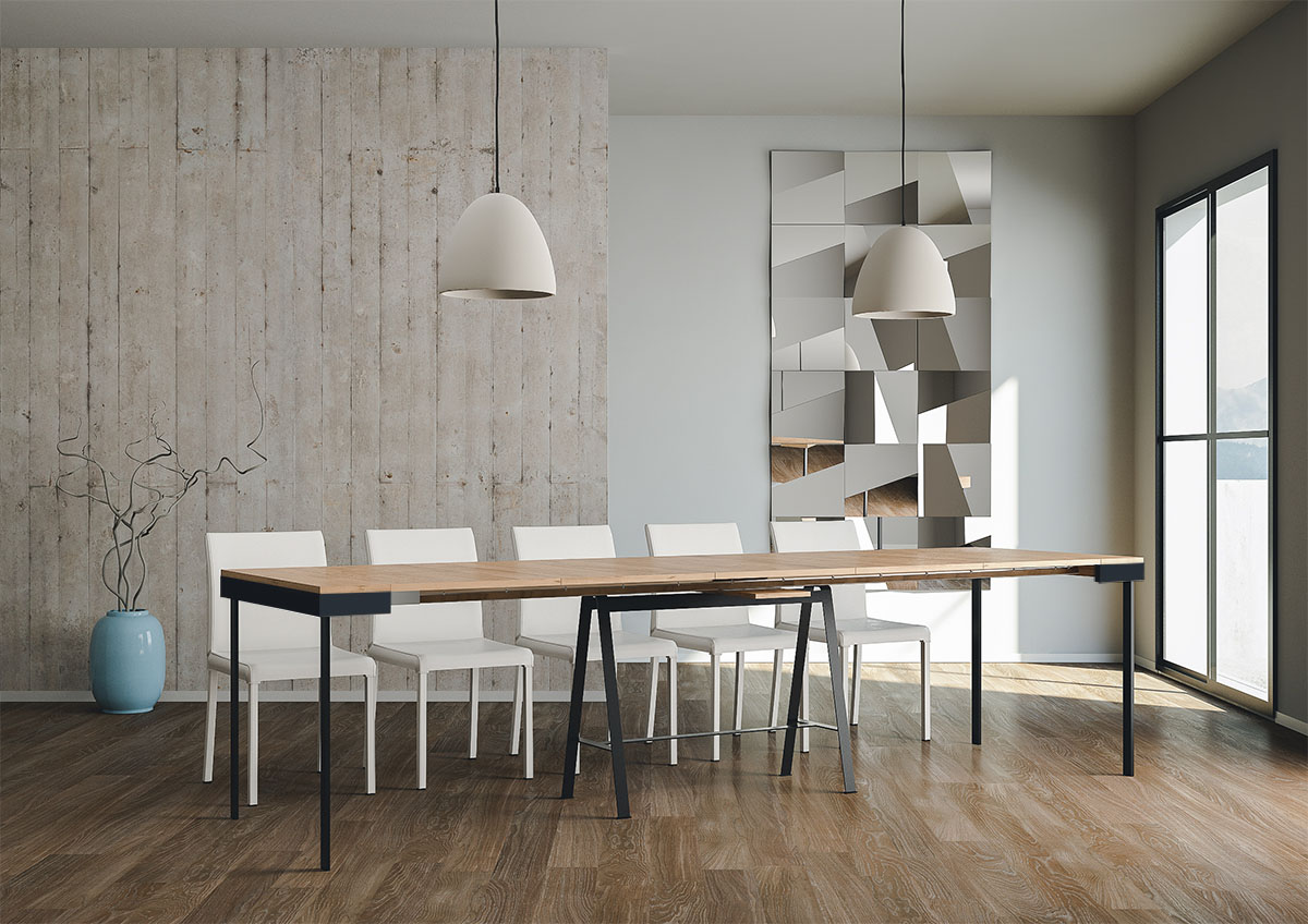 Der ausziehbare Konsolentisch Banco Evolution ist vielseitig und robust und somit die perfekte Ergänzung für jeden Raum im Haus: Eingangsbereich, Küche, Esszimmer, Wohnzimmer oder Flur. Der ausziehbare Konsolentisch Banco Evolution lässt sich leicht in einen großen Esstisch mit bis zu 300 cm Länge und Platz für 14 Personen verwandeln. Aus melaminharzbeschichteten Platten, mit Rahmen und Beinen aus Eisen. Das Ausziehsystem mit Teleskopschienen aus Aluminium und die mitgelieferten Seitenstützen machen den Konsolentisch stabil und robust. Sobald der Konsolentisch geschlossen ist, müssen die Verlängerungen verstaut werden. Itamoby-Produkt, Made in Italy. Abmessungen: Geschlossener Konsolentisch: B 90 T 40 H 77 cm. Länge mit 1 Verlängerung: 92 cm. Länge mit 2 Verlängerungen: 144 cm. Länge mit 3 Verlängerungen: 196 cm. Länge mit 4 Verlängerungen: 248 cm. Länge mit 5 Verlängerungen: 300 cm.