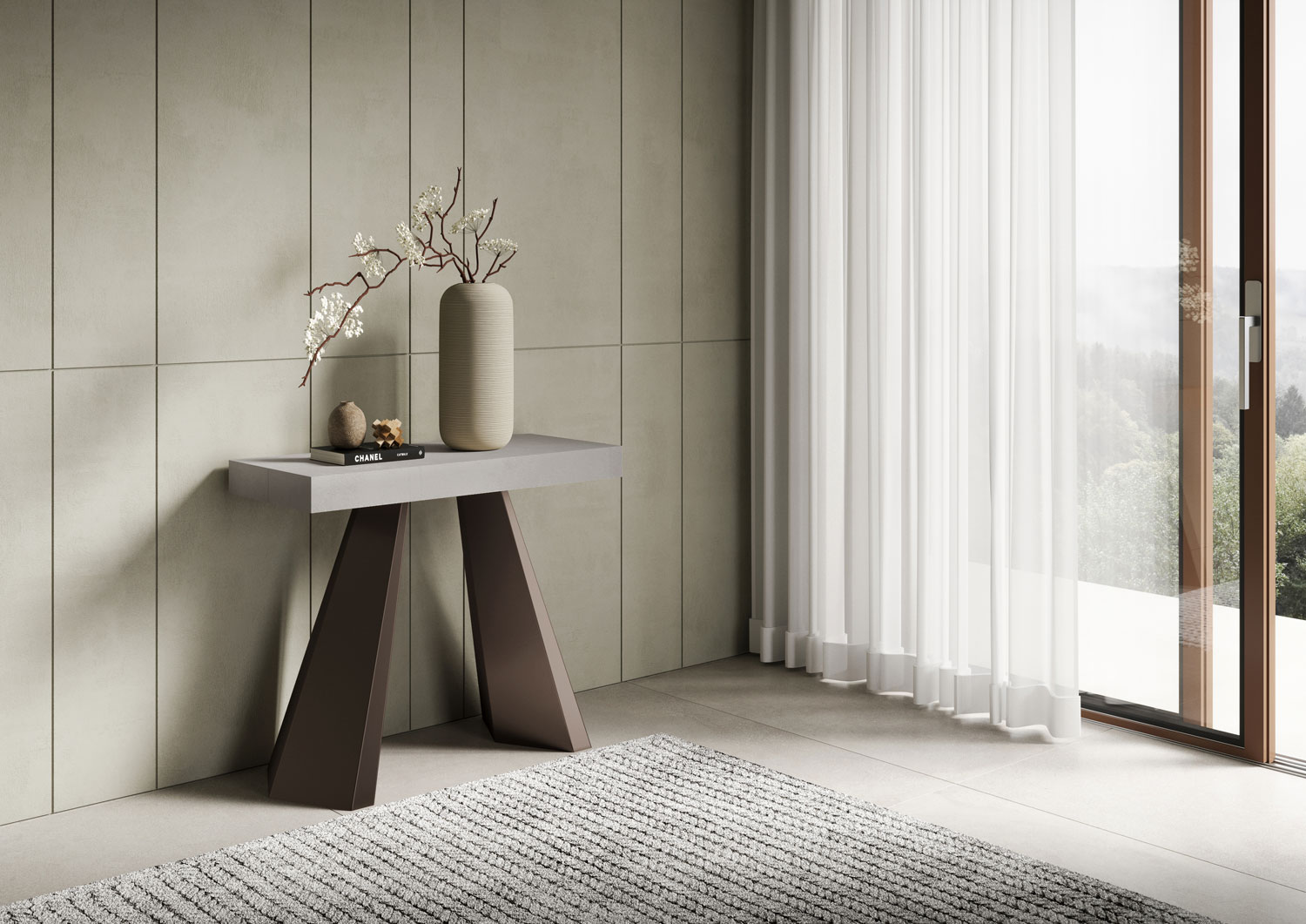 Ausziehbarer Konsolentisch Diamante Small, vielseitig und robust, ein perfektes Möbelstück für jeden Raum im Haus: Eingangshalle, Küche, Esszimmer, Wohnzimmer oder Flur. Der ausziehbare Konsolentisch Diamante Small lässt sich leicht in einen großen Esstisch mit einer Länge von bis zu 196 cm verwandeln, an dem bis zu 10 Personen Platz finden. Mit melaminbeschichteten Spanplatten und Eisenbeinen hergestellt. Das Auszugssystem mit Aluminium-Teleskopschienen und die mitgelieferten Seitenstützen machen den Konsolentisch stabil und robust. Im geschlossenen Zustand müssen die Verlängerungen irgendwo anders im Haus verstaut werden. Itamoby Produkt Made in Italy Produkt Maße: Im geschlossenen Zustand: B.90 T.40 H.77 cm Mit 1 Verlängerung im Einsatz: 92 cm Mit 2 Verlängerungen im Einsatz: 144 cm Mit 3 Verlängerungen im Einsatz: 196 cm