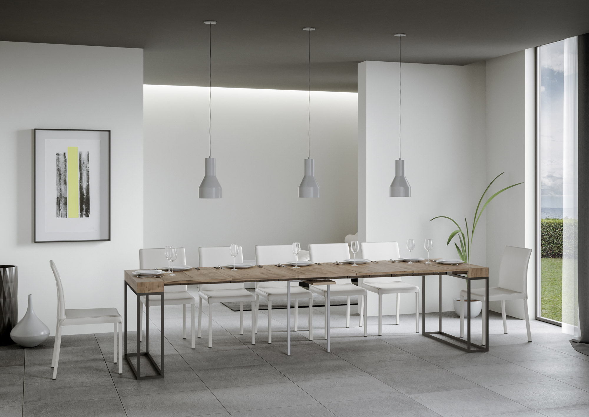 Der ausziehbare Konsolentisch Epoca ist vielseitig und robust und somit eine perfekte Ergänzung für jeden Raum im Haus: Eingangsbereich, Küche, Esszimmer, Wohnzimmer oder Flur. Der ausziehbare Konsolentisch Epoca lässt sich leicht in einen großen Esstisch mit bis zu 300 cm Länge und Platz für 14 Personen verwandeln. Das Ausziehsystem aus Melaminplatten und Eisenbeinen verfügt über Teleskopschienen aus Aluminium und eine zentrale Stütze, die dem Konsolentisch Stabilität und Robustheit verleihen. Sobald der Konsolentisch geschlossen ist, müssen die Verlängerungen verstaut werden. Itamoby-Produkt, Made in Italy. Abmessungen: Geschlossener Konsolentisch: B 90 T 40 H 77 cm. Länge mit 1 Verlängerung: 92 cm. Länge mit 2 Verlängerungen: 144 cm. Länge mit 3 Verlängerungen: 196 cm. Länge mit 4 Verlängerungen: 248 cm. Länge mit 5 Verlängerungen: 300 cm.