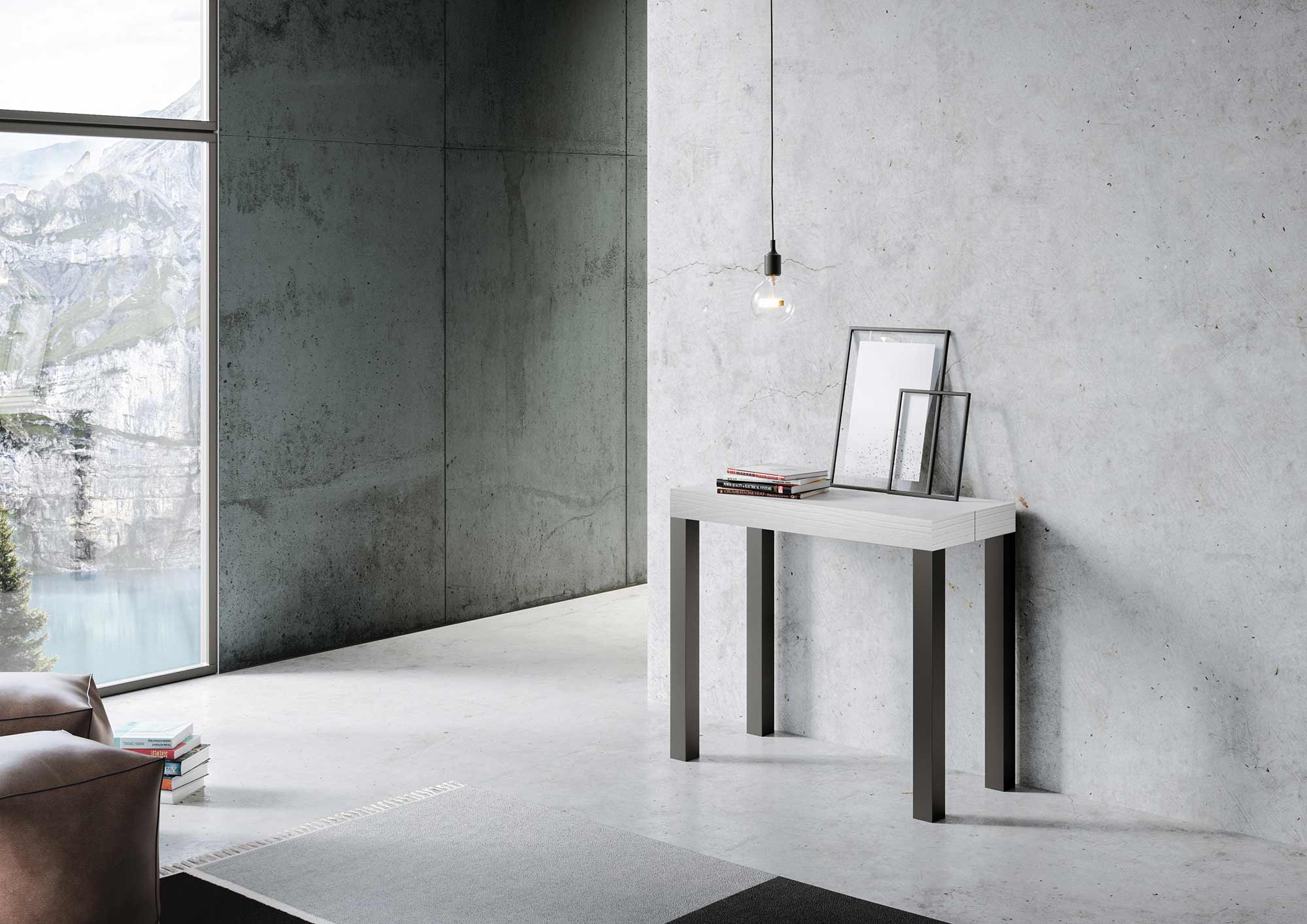 Ausziehbarer Konsolentisch Everyday, vielseitig und robust, ein perfektes Möbelstück für jeden Raum im Haus: Eingangshalle, Küche, Esszimmer, Wohnzimmer oder Flur. Der ausziehbare Konsolentisch Everyday lässt sich leicht in einen großen Esstisch mit einer Länge von bis zu 300 cm verwandeln, an dem bis zu 14 Personen Platz finden. Mit melaminbeschichteten Spanplatten und Eisenbeinen hergestellt. Das Auszugssystem mit Aluminium-Teleskopschienen und die zentrale Unterstütze machen den Konsolentisch stabil und robust. Im geschlossenen Zustand müssen die Verlängerungen irgendwo anders im Haus verstaut werden. Itamoby Produkt Made in Italy Produkt Maße: Im geschlossenen Zustand: B.90 T.40 H.77 cm Mit 1 Verlängerung im Einsatz: 92 cm Mit 2 Verlängerungen im Einsatz: 144 cm Mit 3 Verlängerungen im Einsatz: 196 cm Mit 4 Verlängerungen im Einsatz: 248 cm Mit 5 Verlängerungen im Einsatz: 300 cm