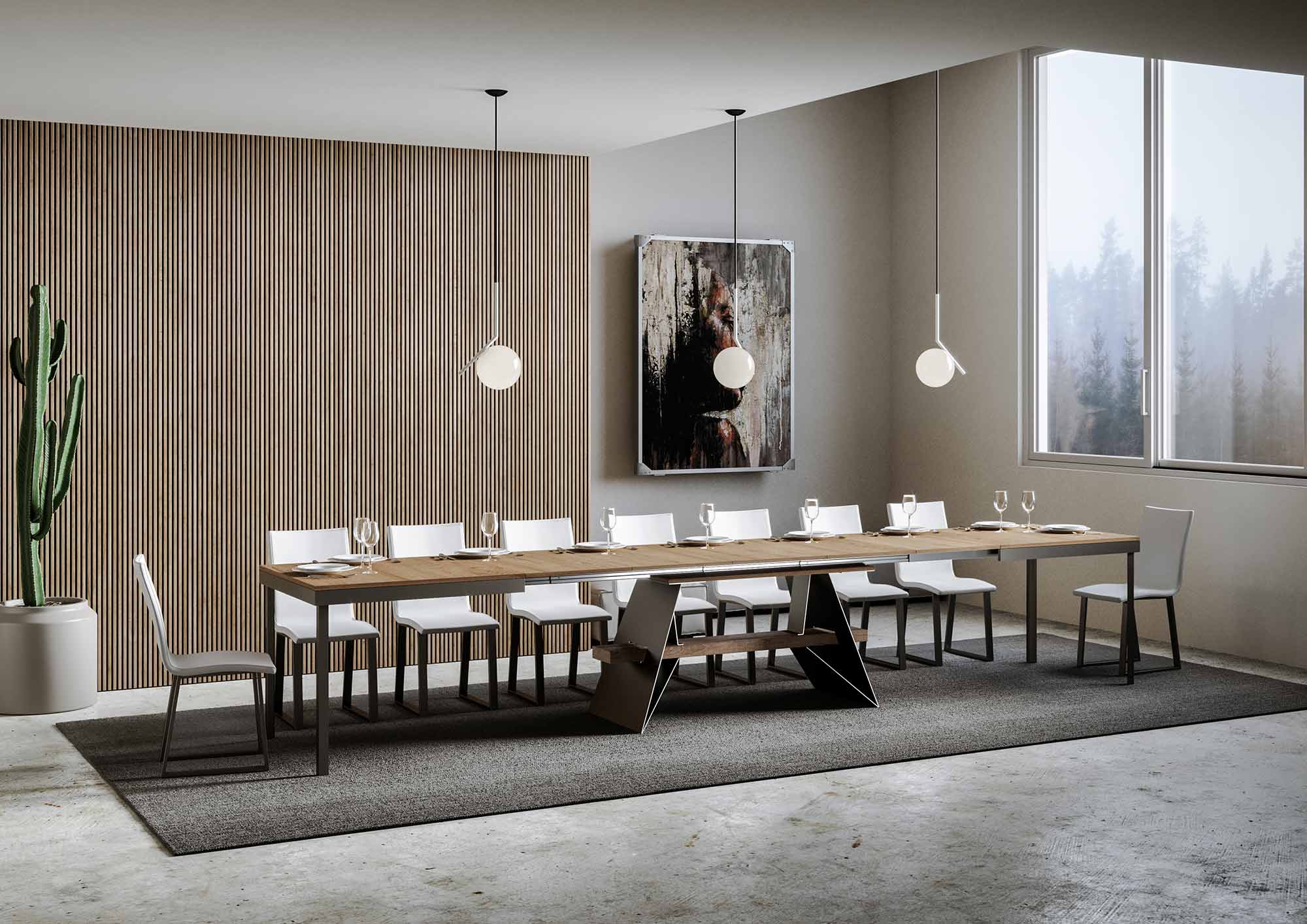 Der 160 cm lange ausziehbare Tisch Baita Evolution mit seinem industriellen Design passt zu jedem Einrichtungsstil und ist die ideale Wahl sowohl als Esstisch als auch als Wohnzimmermöbel, an dem Sie Ihre Gäste stilvoll empfangen können. Der ausziehbare Tisch Baita Evolution kann stufenlos bis auf 420 cm ausgezogen werden und bietet Platz für 18 Personen. Hergestellt mit Melaminplatten, Eisenrahmen und -beinen. Das Ausziehsystem mit Teleskopführungen aus Aluminium und die mitgelieferten Seitenstützen machen den Tisch auch im voll ausgezogenen Zustand stabil und robust. Zwei Verlängerungsplatten sind gebrauchsfertig unter der Platte untergebracht, während die restlichen drei woanders aufbewahrt werden können. Itamoby-Produkt Hergestellt in Italien Abmessungen: Geschlossener Tisch: B 160 T 90 H 77 cm Länge mit 1 Verlängerung: 212 cm Länge mit 2 Verlängerungen: 264 cm Länge mit 3 Verlängerungen: 316 cm Länge mit 4 Verlängerungen: 368 cm Länge mit 5 Verlängerungen: 420 cm
