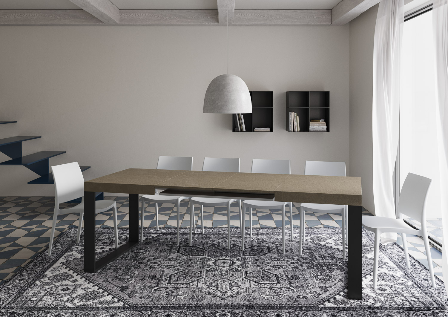 Ausziehtisch Tecno 120, aus schlichtem und essentiellem Design, fügt sich perfekt in jeden Einrichtungskontext ein und ist die ideale Lösung sowohl für die Küche als auch für das Wohnzimmer, wo Sie Ihre Gäste immer stilvoll empfangen können. Der Ausziehtisch Tecno lässt sich schrittweise bis 224 cm ausziehen, mit Platz für bis 10 Personen. Melaminbeschichtete Spanplatten, Eisenbeine, die Haupttischplatte wird mit Folding-Bearbeitung gefertigt. Das Auszugssystem mit Aluminium-Teleskopschienen macht den Tisch auch im ausgezogenen Zustand stabil und robust, ohne dass zusätzliche Stützen erforderlich sind. Die Verlängerungen sind sofort einsatzbereit, da sie unter der Hauptplatte des Tisches untergebracht sind. Itamoby Produkt Made in Italy Maße: Im geschlossenen Zustand: B.120 T.90 H.77 cm Mit 1 Verlängerung im Einsatz: 172 cm Mit 2 Verlängerungen im Einsatz: 224 cm
