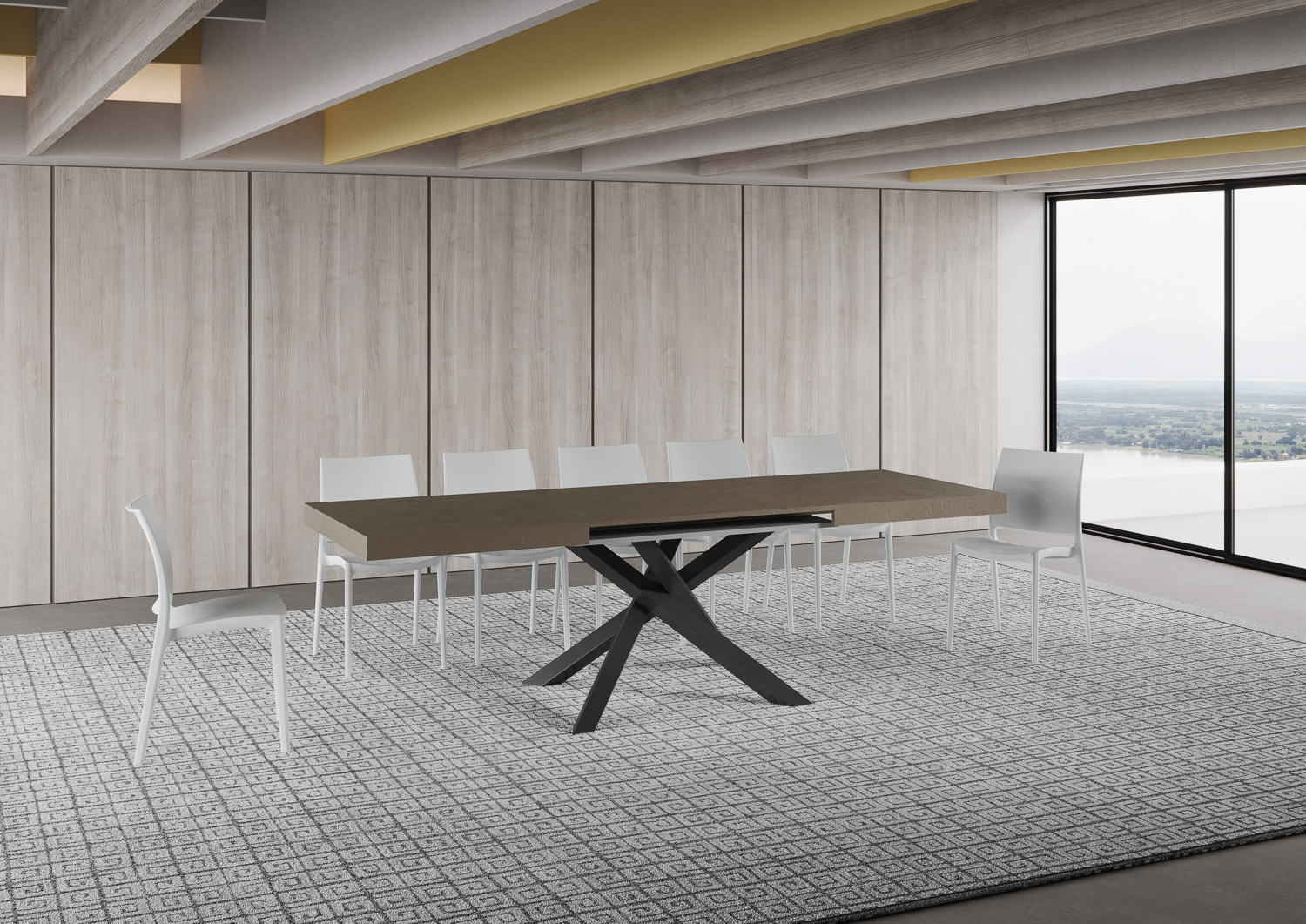 Ausziehtisch Volantis 160, aus modernem Design und anspruchsvollem Stil, fügt sich perfekt in jeden Einrichtungskontext ein und ist die ideale Lösung sowohl für die Küche als auch für das Wohnzimmer, wo Sie Ihre Gäste immer stilvoll empfangen können. Der Ausziehtisch Volantis lässt sich schrittweise bis 264 cm ausziehen, mit Platz für bis 12 Personen. Melaminbeschichtete Spanplatten, Eisenbeine, die Haupttischplatte wird mit Folding-Bearbeitung gefertigt. Das Auszugssystem mit Aluminium-Teleskopschienen macht den Tisch auch im ausgezogenen Zustand stabil und robust, ohne dass zusätzliche Stützen erforderlich sind. Die Verlängerungen sind sofort einsatzbereit, da sie unter der Hauptplatte des Tisches untergebracht sind. Itamoby Produkt Made in Italy Maße: Im geschlossenen Zustand: B.160 T.90 H.77 cm Mit 1 Verlängerung im Einsatz: 212 cm Mit 2 Verlängerungen im Einsatz: 264 cm