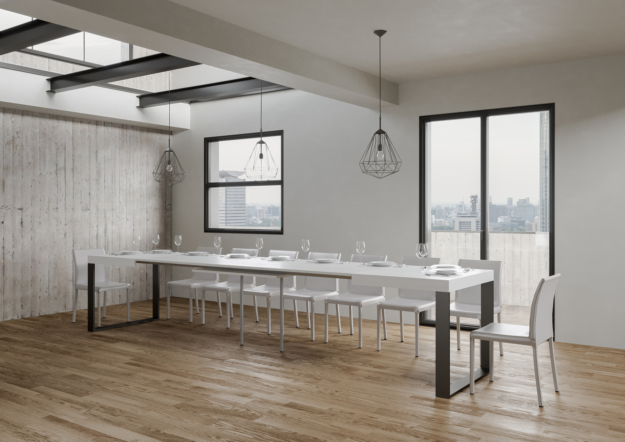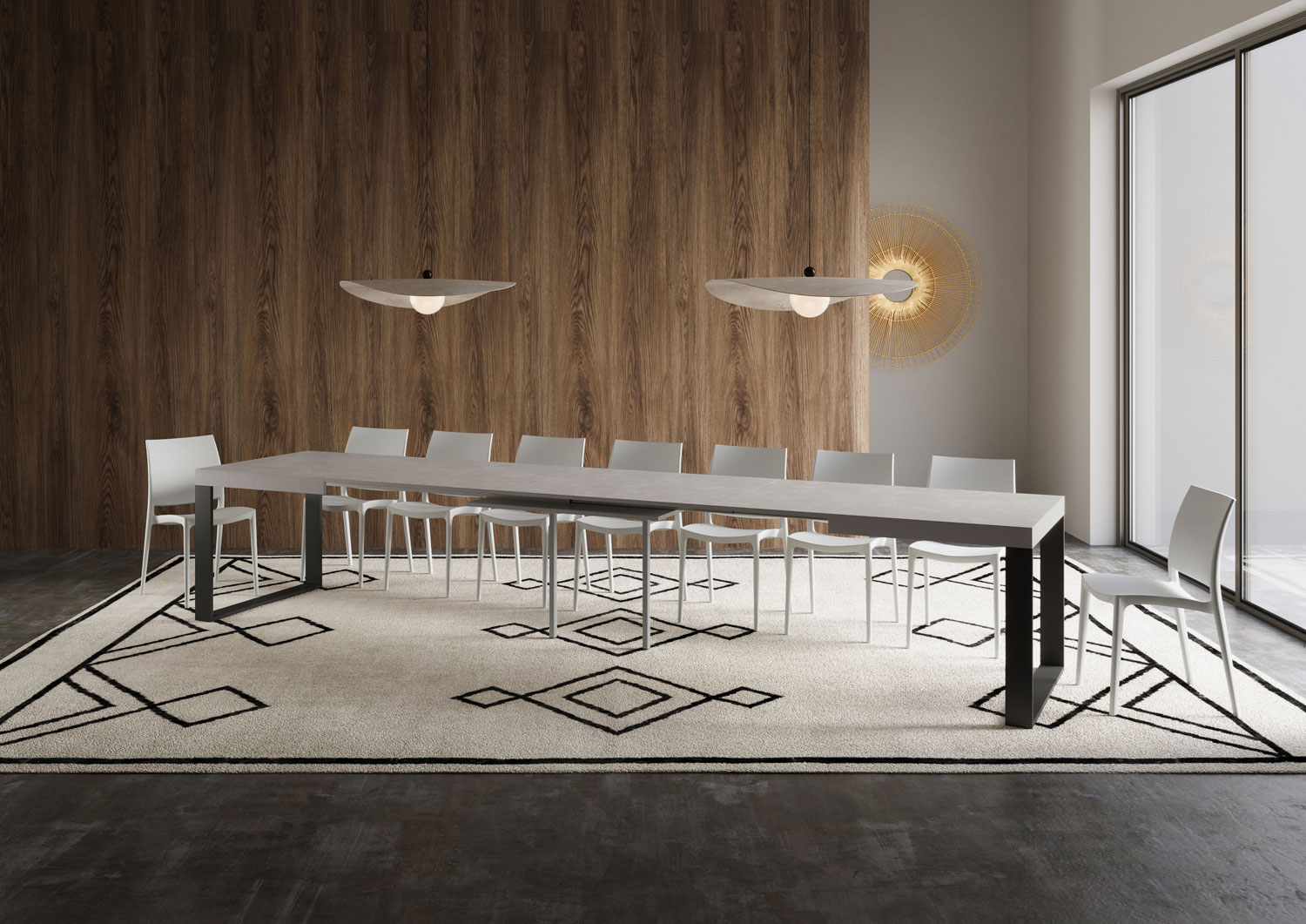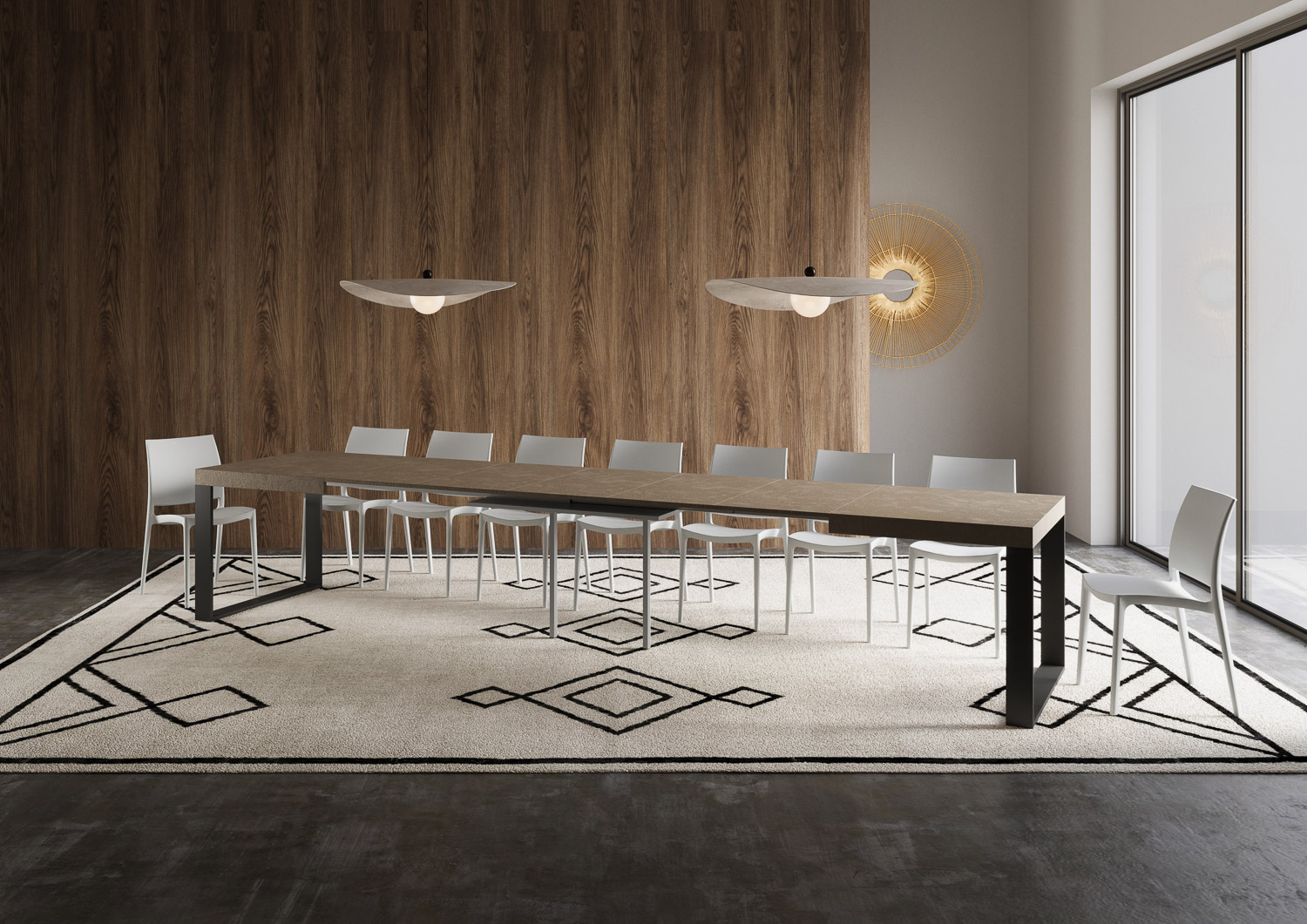 Der Ausziehtisch Tecno lässt sich schrittweise bis 420 cm ausziehen, mit Platz für bis 18 Personen.