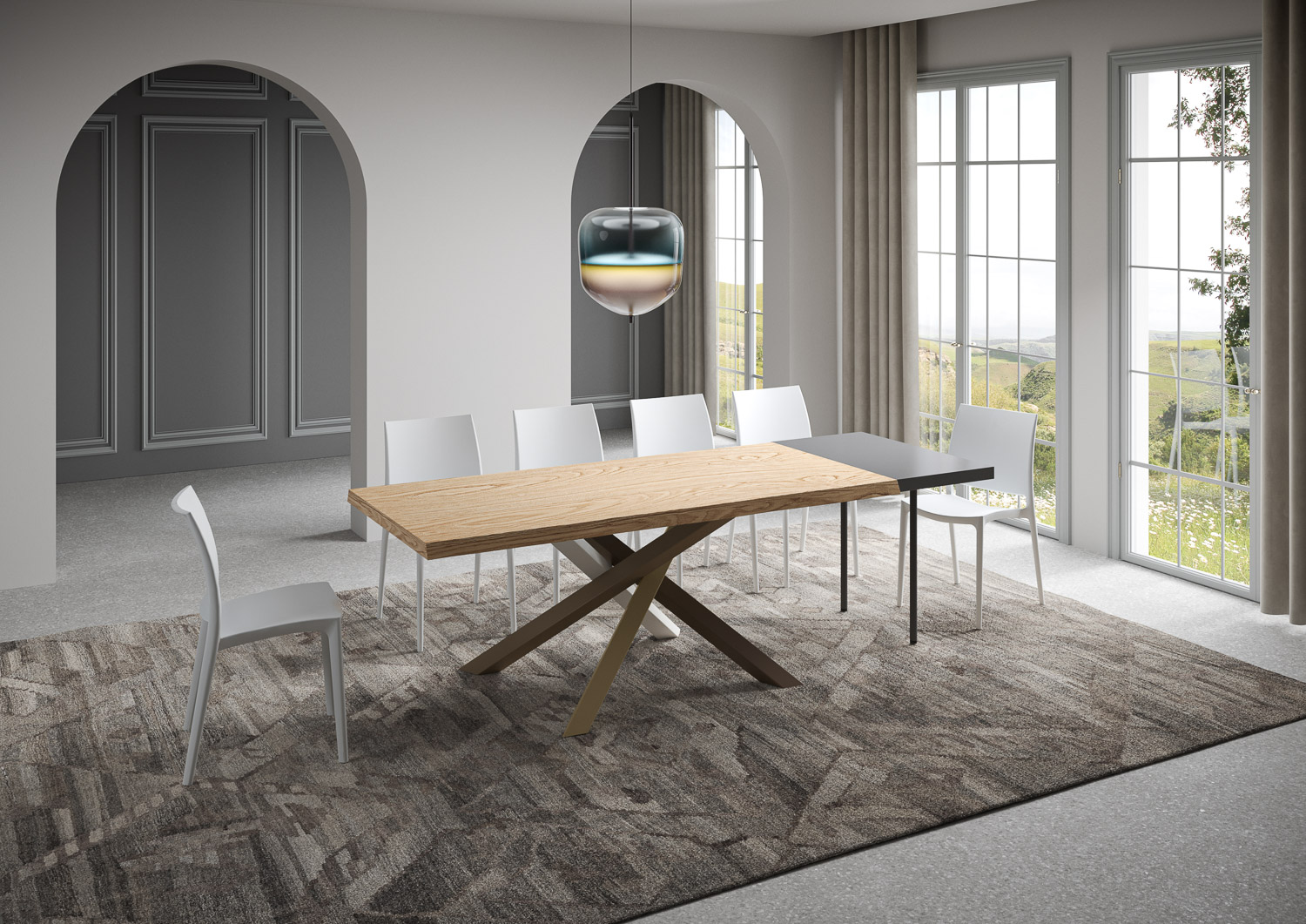 Der 200 cm lange, ausziehbare Versalux-Tisch mit seinem raffinierten, modernen Design passt zu jedem Einrichtungsstil und ist die ideale Wahl sowohl als Esstisch als auch als Wohnzimmermöbel, an dem Sie Gäste stilvoll empfangen können. Der Versalux-Ausziehtisch lässt sich auf bis zu 250 cm ausziehen und bietet Platz für 12 Personen. Er ist mit einer Tischplatte aus Eichenfurnier, Massivholz an allen vier Seiten und entrindetem Holz an den Längsseiten gefertigt und verfügt über eine Verlängerung aus Wabenplatten und lackierte Eisenbeine. Die Verlängerung ist in Anthrazit gehalten, um Farbabweichungen zur Holzplatte zu vermeiden, die sich im Laufe der Zeit durch Lichteinwirkung verfärben kann. Die Verwendung einer Verlängerung in der gleichen Farbe kann zu optischen Unterschieden führen, während Anthrazit ein einheitliches und langlebiges Erscheinungsbild gewährleistet. Die Verlängerung passt nicht in den Tisch und sollte woanders aufbewahrt werden. Dicke der Platte und der Verlängerung: 5 cm. Produkt: Itamoby. Hergestellt in Italien. Abmessungen: Geschlossener Tisch: L.200 T.90 H.75 cm. Länge mit 1 Verlängerung: 250 cm
