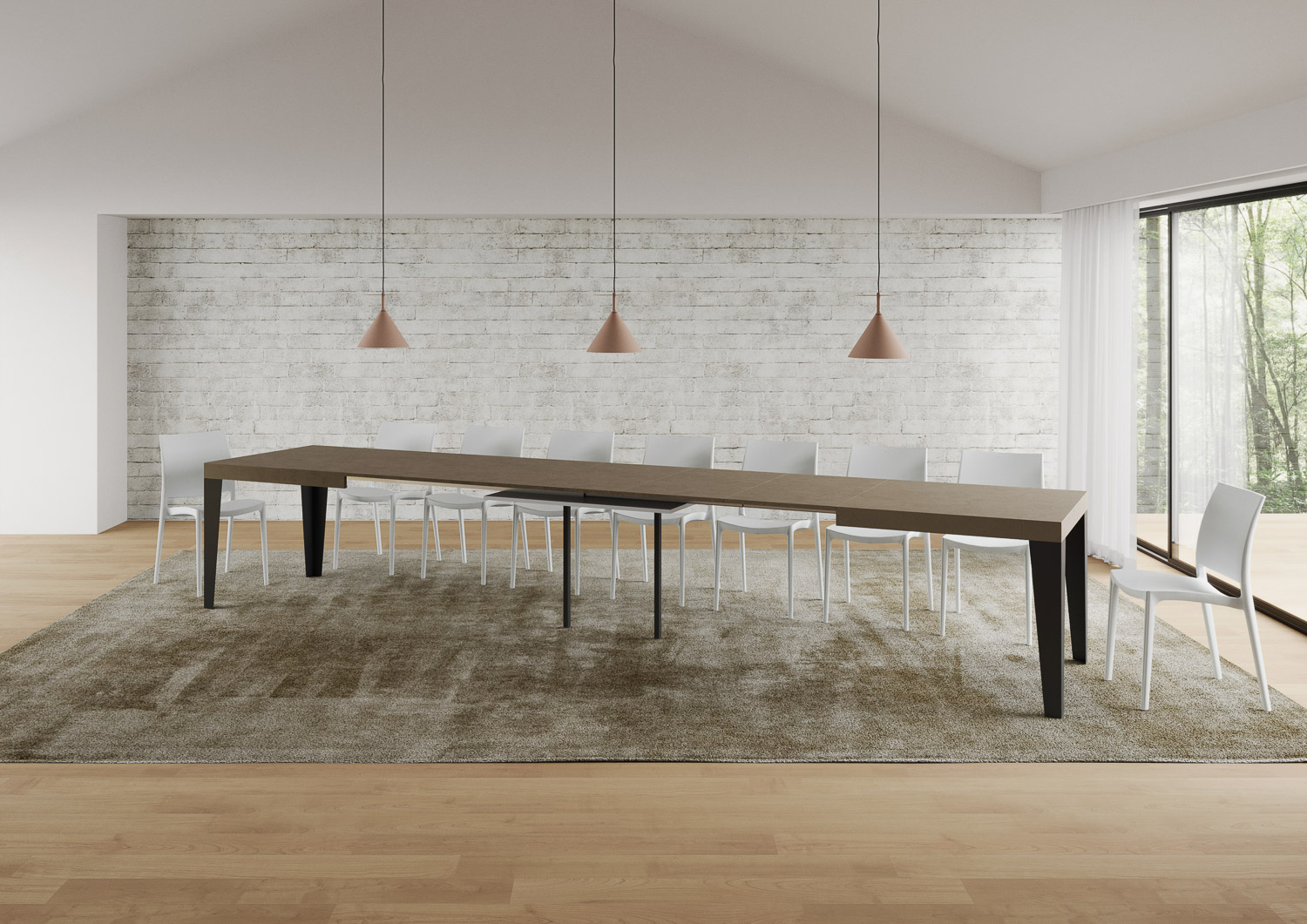 Der Ausziehtisch Flame lässt sich schrittweise bis 460 cm ausziehen, mit Platz für bis 18 Personen.