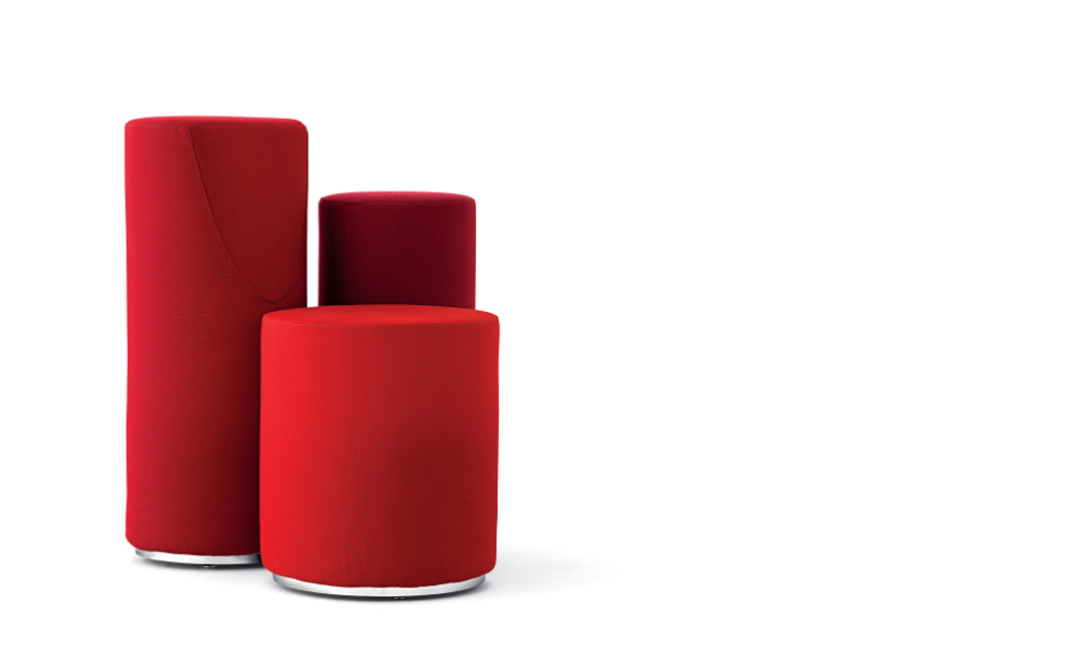 Dekonstruierter Sessel aus drei unterschiedlich hohen Zylindern, die durch einen polierten Edelstahlsockel verbunden sind. Abnehmbarer Stoff aus Baumwolle, Wolle oder Samt.