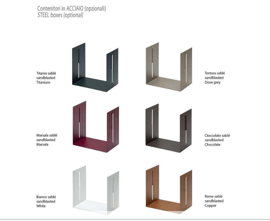 Die Konstruktionen können mit optionalen Containern aus 1,5 mm dickem, sandgestrahltem Stahlblech oder 12 mm dickem, umweltfreundlichem Laminat ergänzt werden.