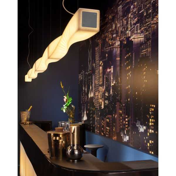Spin ist die Pendelleuchte von Slide, die aus der Drehung eines quaderförmigen Elements mit quadratischer Basis entsteht, ihre Modularität ermöglicht lange und geschwungene Elemente, die nach Belieben kombiniert werden können. Auch als Wandversion erhältlich.