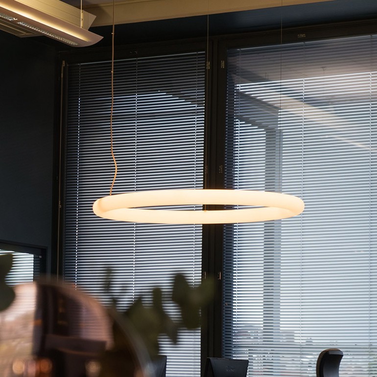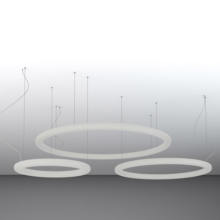 Giotto ist eine Pendelleuchte von Slide aus Polyethylen des Designers Roberto Paoli. Es besteht aus einem LED-Lichtring, der in drei verschiedenen Varianten mit einem Durchmesser von 80, 110 und 140 cm erhältlich ist. Sie zeichnet sich durch einen einzigen Diffusor aus und ist in der Lage, die Räume homogen zu beleuchten. Seine essentielle Geometrie macht es elegant und geeignet für den Einzelgebrauch oder in unendlichen Kompositionen und schafft eine szenografische Umgebung sowohl für Vertrags- als auch für Wohnräume.