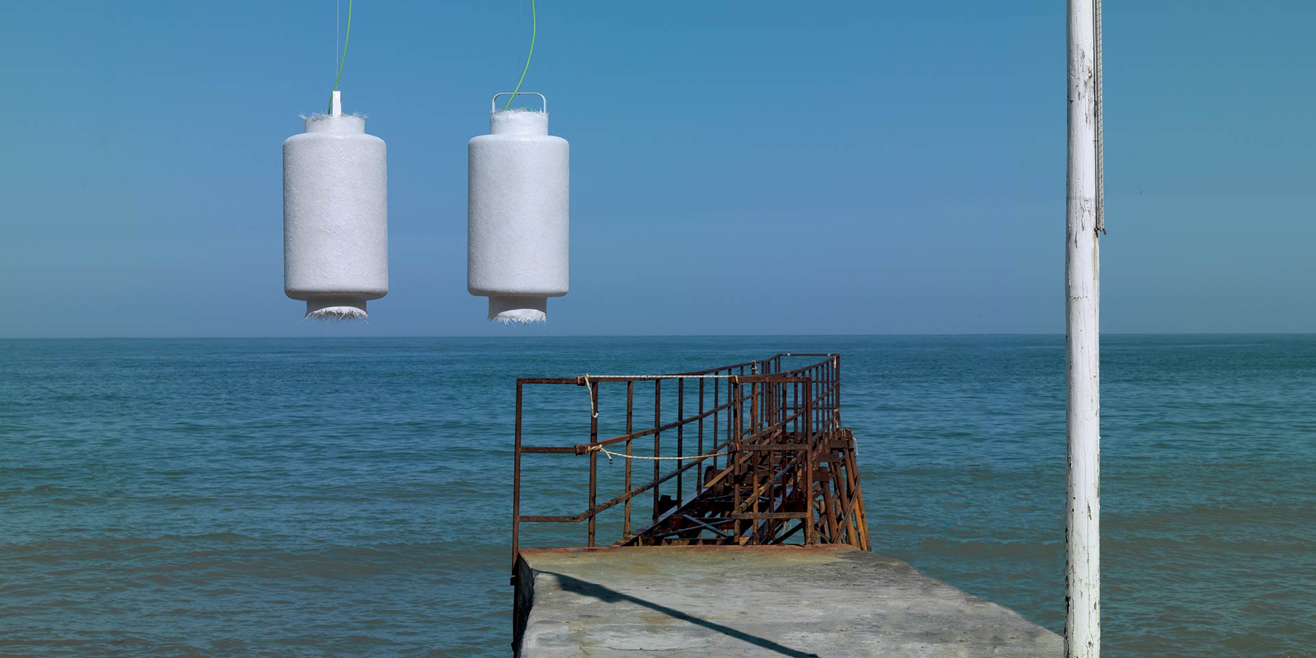 Kimono hat einen weißen Fiberglaskörper, ein Stahlseil zur Aufhängung mt. 2, transparent/grünes Elektrokabel 2/5 m lang und ist in folgenden Abmessungen erhältlich: