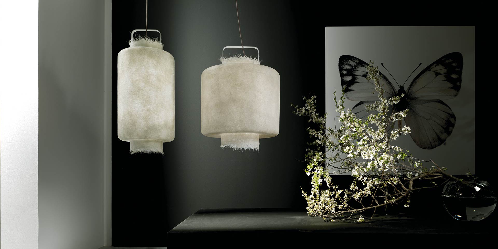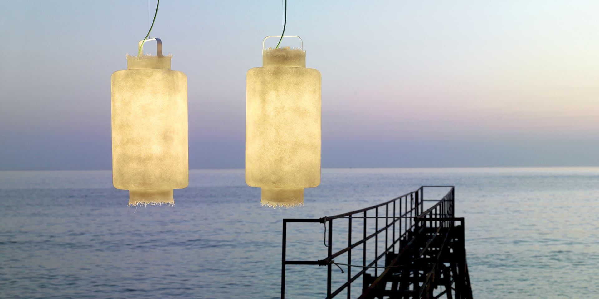 Kimono Karman, eine Outdoor-Aufhängung mit warmem und vollem Licht, eine Laterne, die das Auge fasziniert und das Licht hält, mit ihrer Form scheint sie mit der sie umgebenden Luft zu verschmelzen. KIMONO, eine Aufhängung für den Innen- und Außenbereich, die Ihrem Garten dank der Schutzart IP65 eine wirklich originelle und sichere Note verleiht.