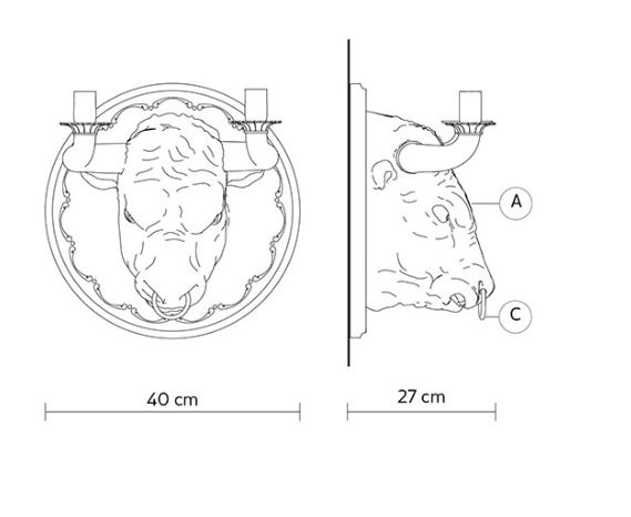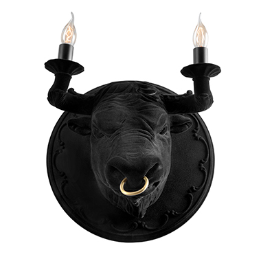 Und der Kopf des Stiers, Symbol der Wut, aber auch männlicher Stärke, komplett mit leuchtenden Hörnern und Nasenring, ist die neue Wandleuchte von Matteo Ugolini.‎