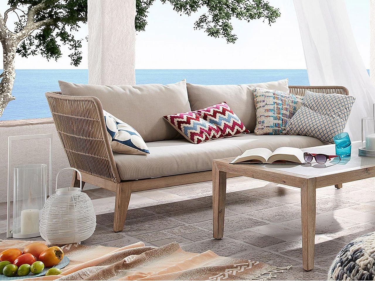 | Material | 52 % Akazienholz (Acacia auriculiformis), 30 % Stahl, 20 % Seil, 8 % Stoff, 6 % Schaumstoff (Polyurethan), 4 % Acrylfasern |