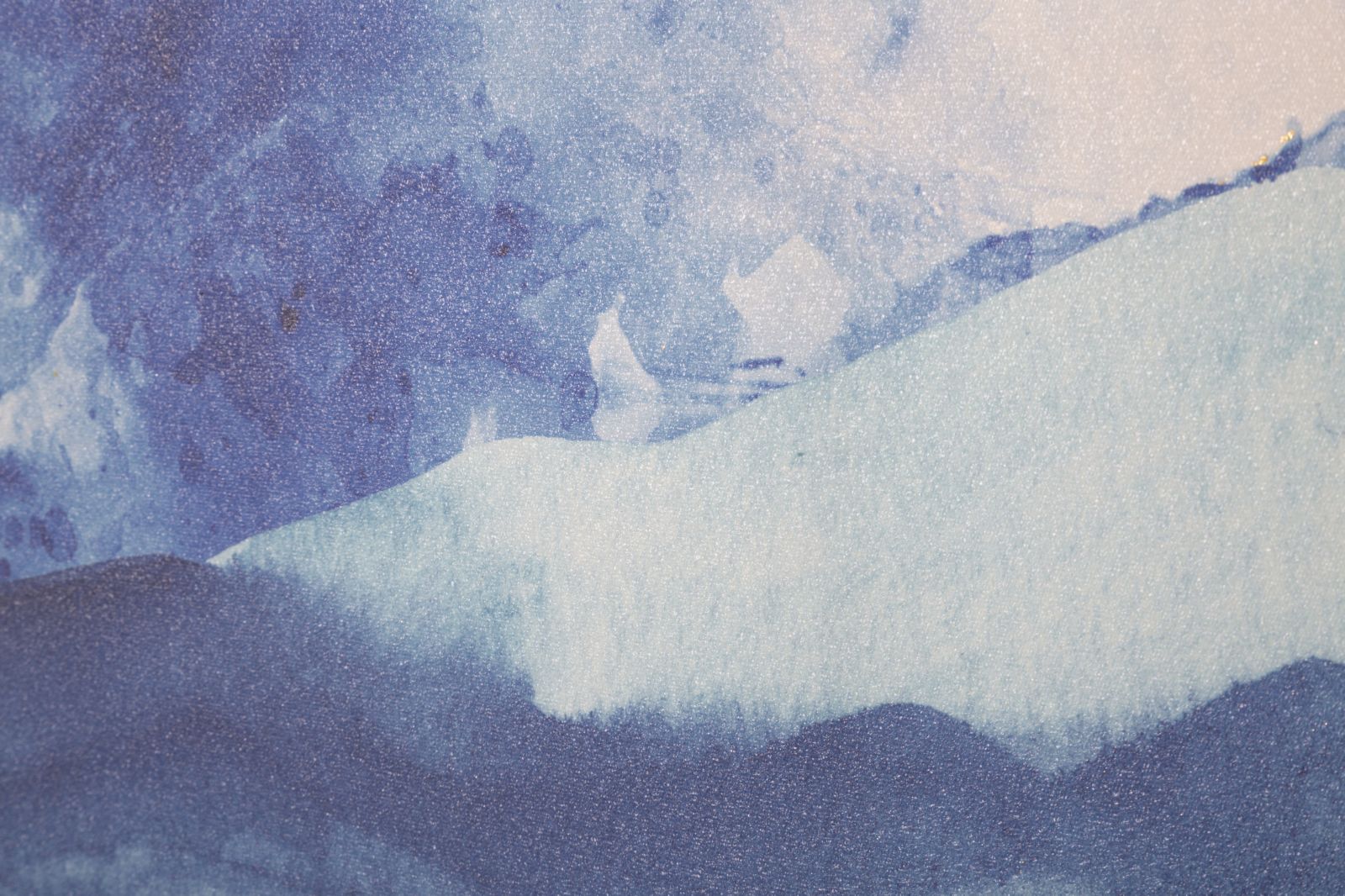 Impressionistischer Leinwanddruck mit Holzrahmen, der an eine Berglandschaft erinnert. Die Blautöne in Kombination mit den goldenen Verzierungen bilden einen zarten Kontrast, der jeder Umgebung einen Hauch von Magie verleiht.