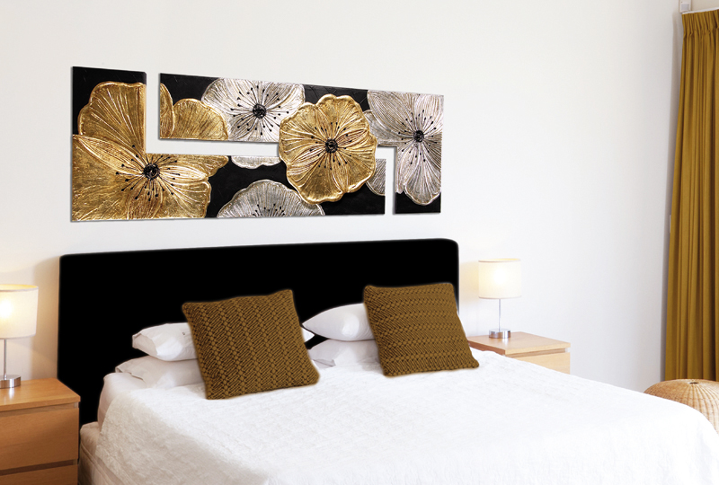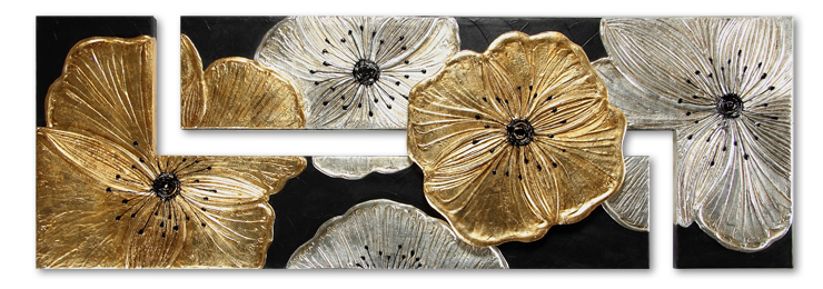 DESIGNBÜRSTE cm 197x67 GOLD-Variante Blumenkomposition auf Leinwand, von Hand verziert, Harzdetails auf strukturierter Doppel-Elle-Struktur mit Mittelelement im Relief, glänzendes Finish.