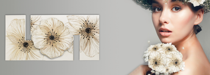 DESIGNBÜRSTE cm 115x55 IVORY-Variante Blumenkomposition auf Leinwand, von Hand verziert, Harzdetails auf strukturierter Doppel-Elle-Struktur mit Mittelelement im Relief, glänzendes Finish.