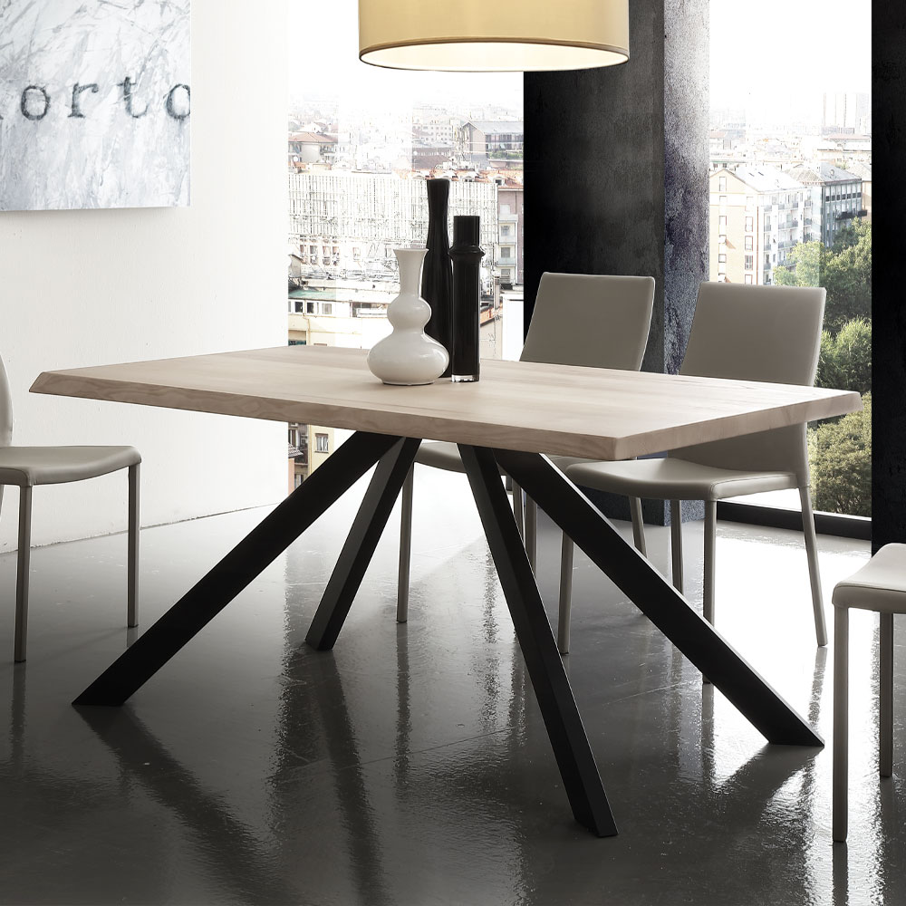 Der Bio-Metalltisch ist eine Designikone, die zeitgenössische Ästhetik mit der authentischen Schönheit von Massivholz verbindet. Er zeichnet sich durch sein schwarz lackiertes Metallgestell und die Tischplatte aus massiver Olivenasche aus.
