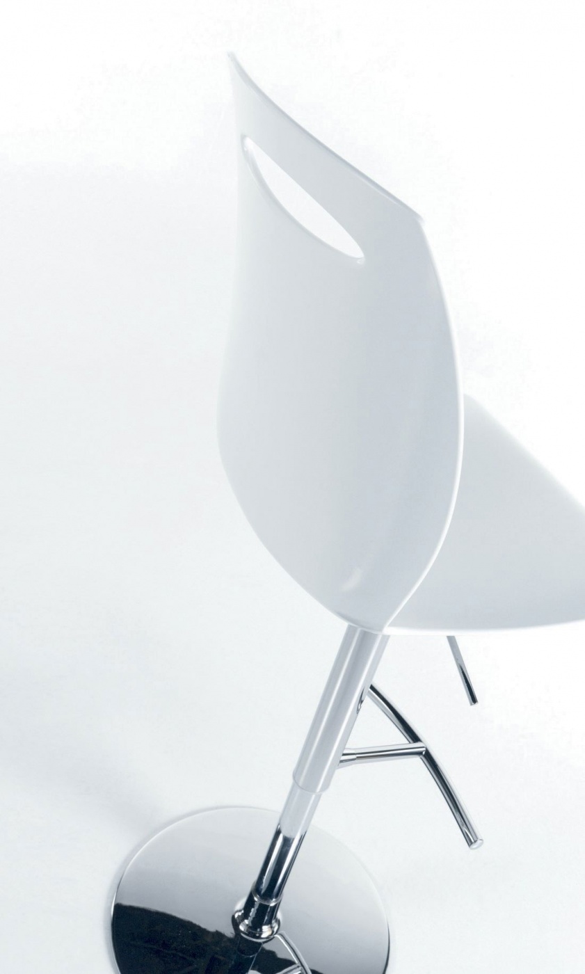 Höhenverstellbarer Hocker mit Aluminium- und Stahlkonstruktion, Stahlkolben und Drehsitz aus weiss Verbundtechnopolymer .