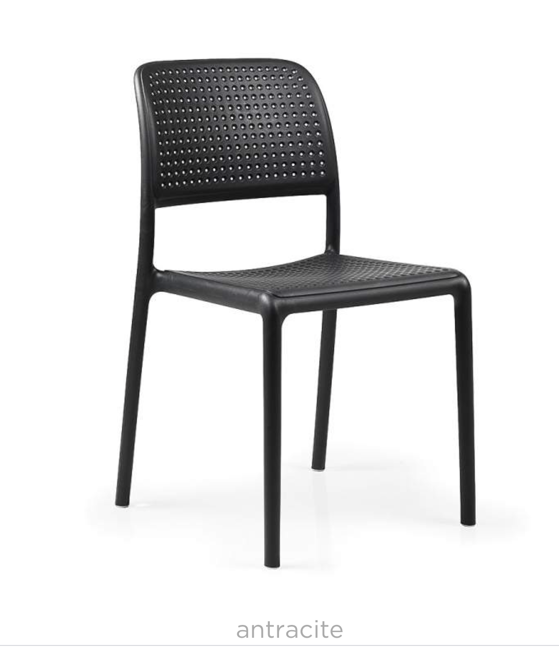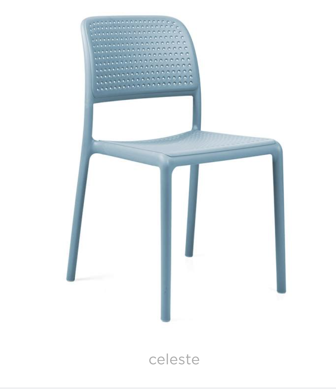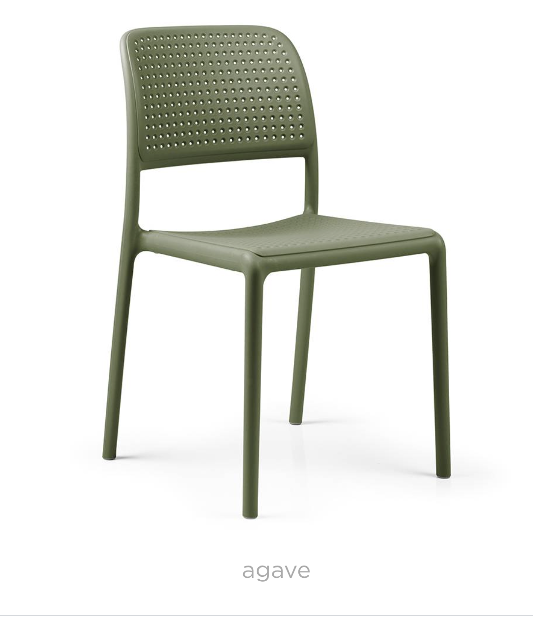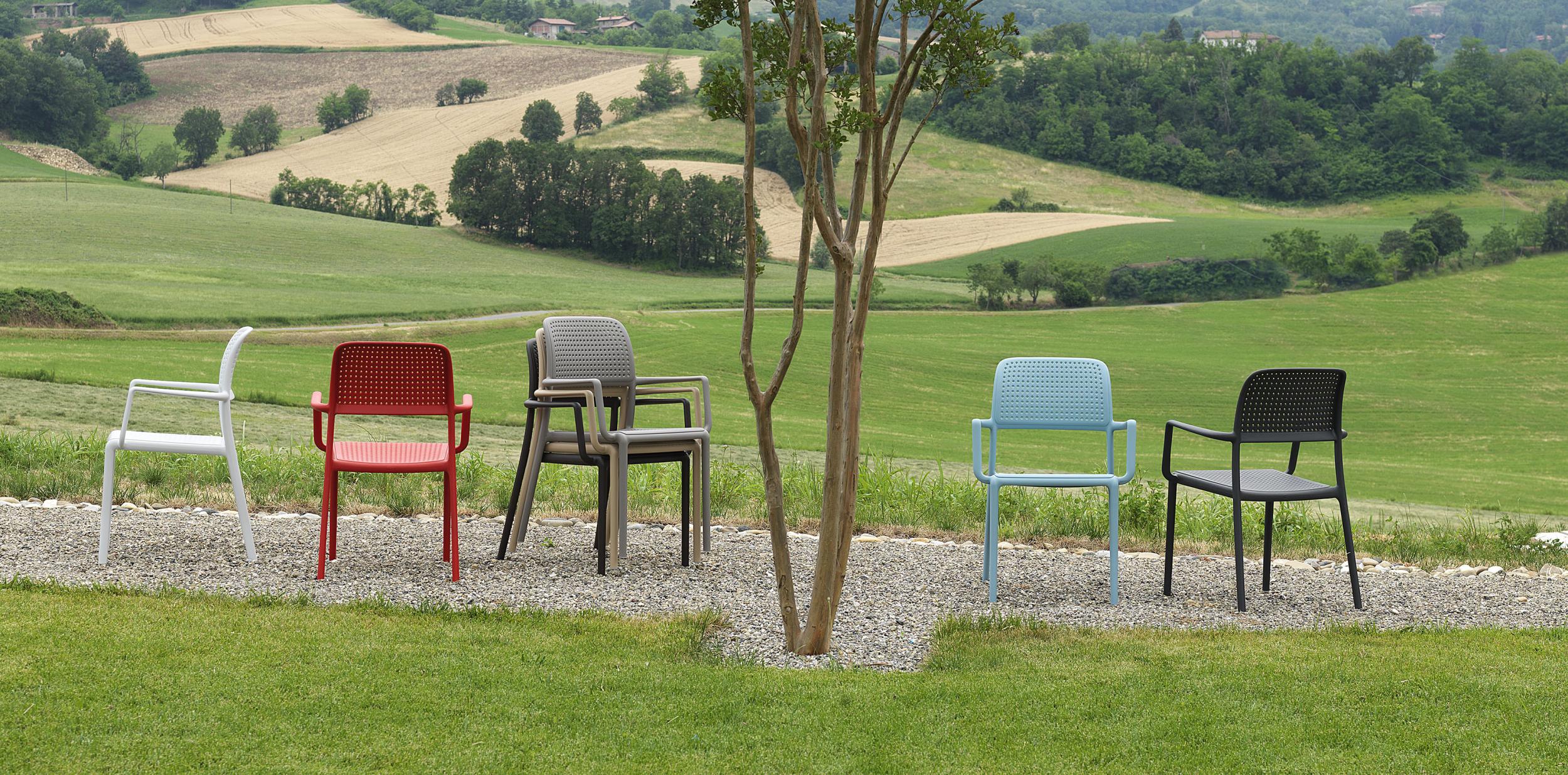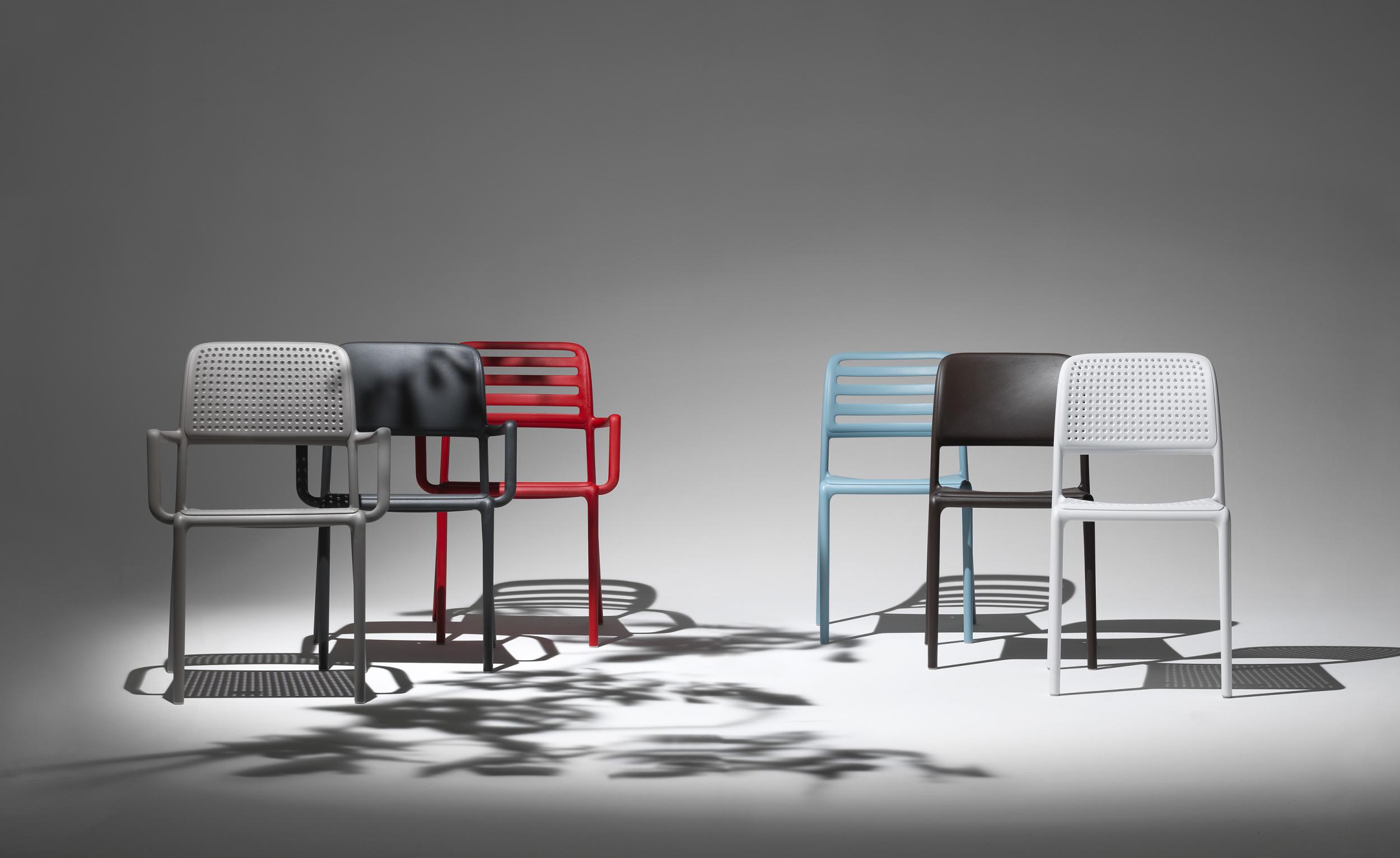 Bora ist ein leichter und frischer Sitz ohne Armlehnen aus glasfaserverstärktem Kunststoff mit durchgehender Rohrstruktur und abgerundeten Profilen. Sitzfläche und Rückenlehne bilden eine Einheit, deren Formen an weiche Textilpolster erinnern.