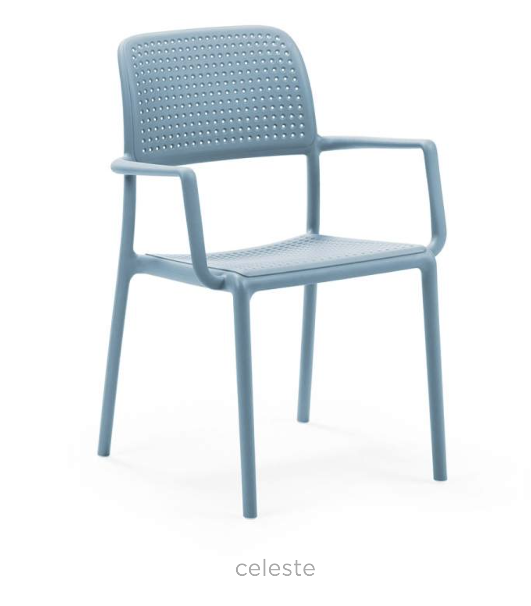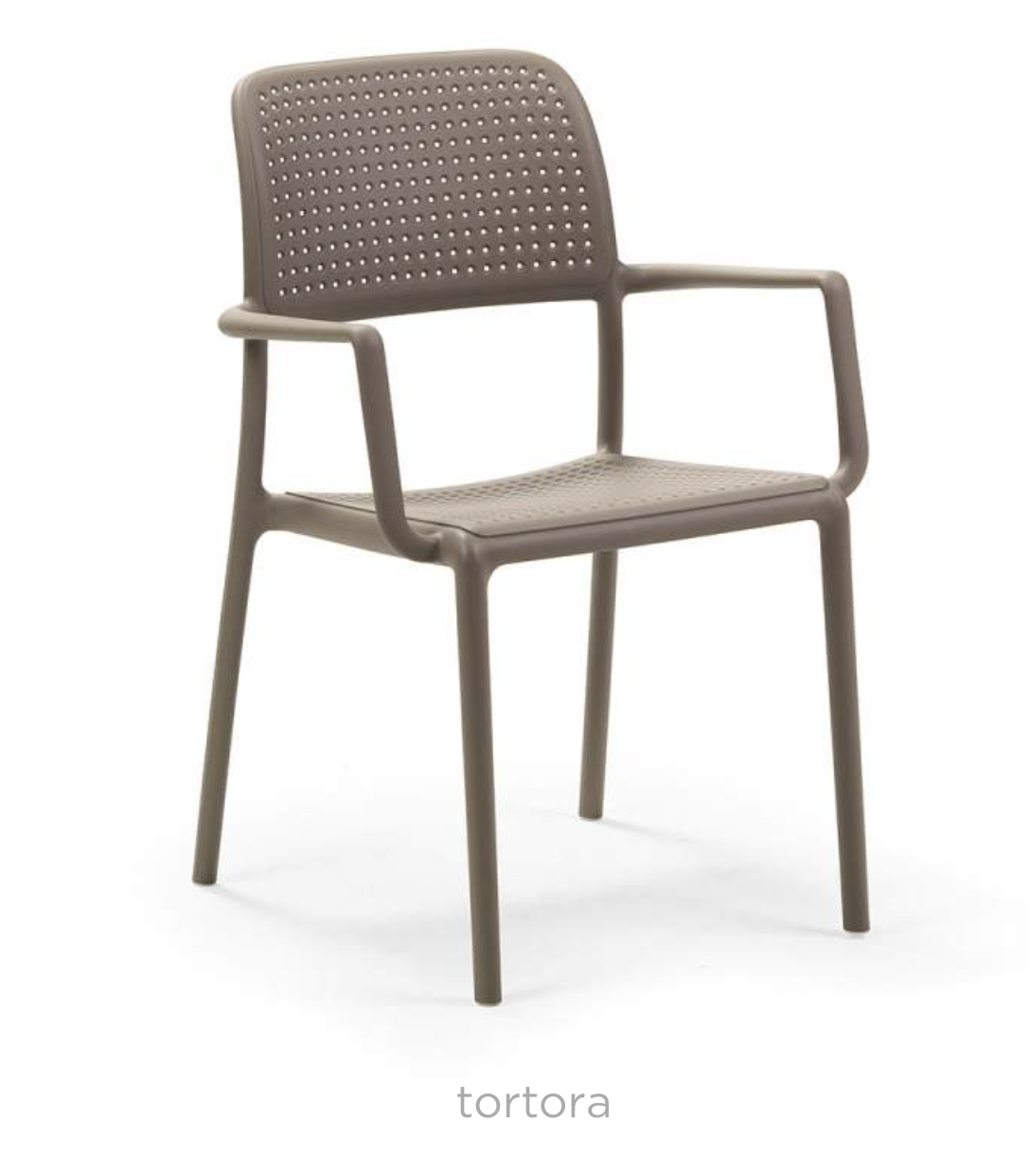 Bora ist ein leichter und frischer, bequemer Sitz aus glasfaserverstärktem Kunststoff mit Armlehnen, einer nahtlosen Rohrstruktur und abgerundeten Profilen. Sitzfläche und Rückenlehne bilden eine Einheit und betonen ästhetisch die Formen, die an weiche Textilpolster erinnern.