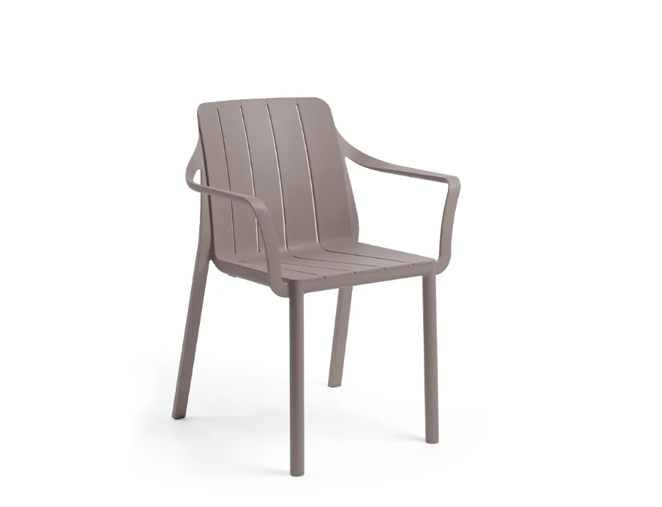 Monoblockstuhl mit Armlehnen. Polypropylen-Glasfaser behandelt Anti-UV und in der Masse gefärbt. Mattes Finish. Ausgestattet mit rutschfesten Füßen. Recycelbares Harz.