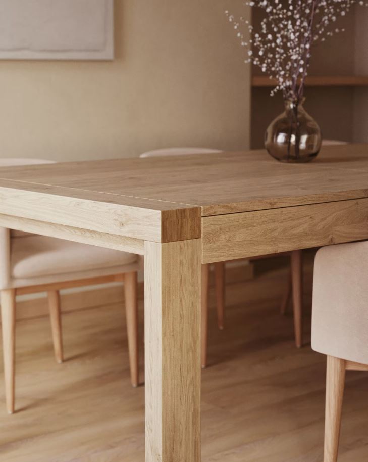 • Tischplatte aus Eichenfurnier, die mit der Maserung und den Schattierungen des Holzes jeden Tisch einzigartig macht.