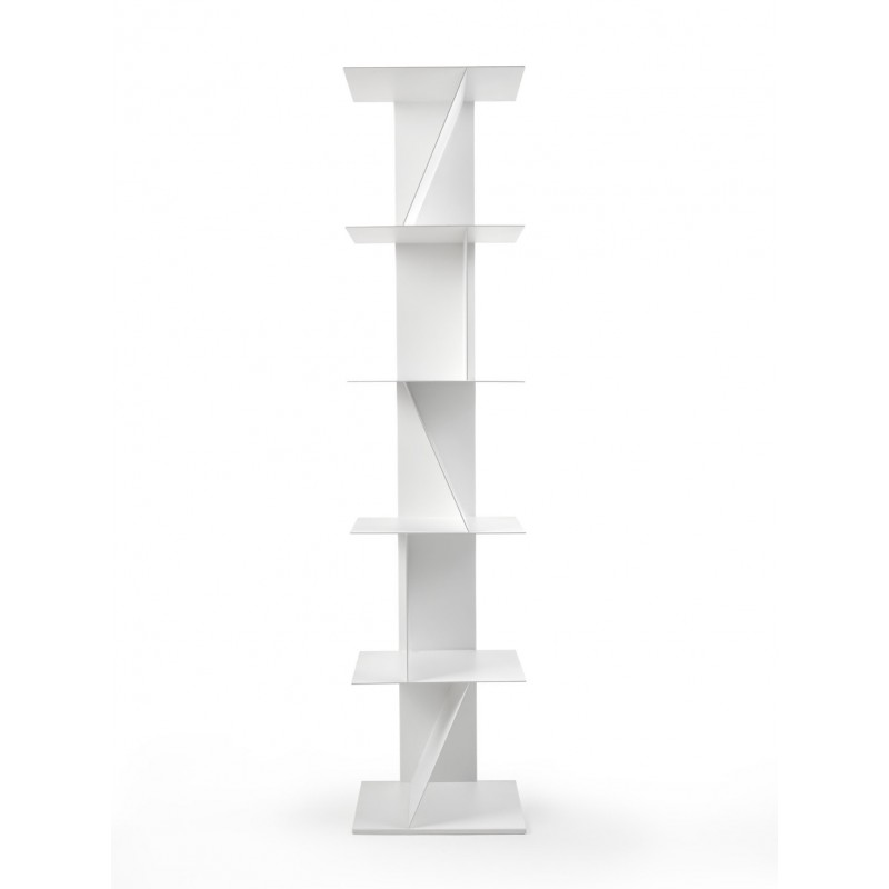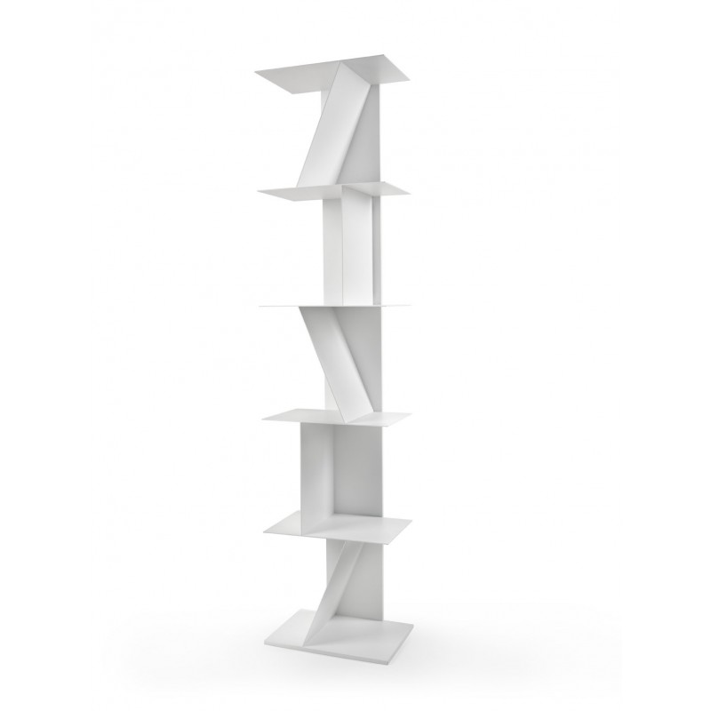 Giove besteht aus lackiertem Stahl und zeichnet sich durch seine dünnen Regale aus, die vertikal, horizontal und im 45-Grad-Winkel angeordnet sind. Dieses geometrische Spiel verleiht dem Bücherregal einen starken grafischen Charakter und verwandelt es in ein Einrichtungsaccessoire, das Aufmerksamkeit erregt und jedem Raum Stil verleiht.