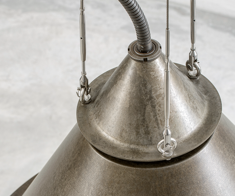 Jede Aufhängung ist mit seitlichen Edelstahlkabeln zur Höhenverstellung während der Installation und einem flexiblen zentralen Metallrohr ausgestattet, das die Struktur vervollständigt.