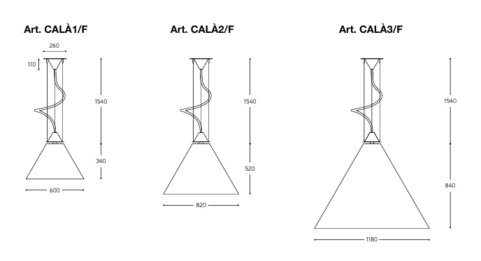 Die Linie Calà ist in drei verschiedenen Größen erhältlich und für die Beleuchtung großer Räume konzipiert, sowohl privater Räume wie Küchen und Wohnzimmer als auch öffentlicher Räume wie Restaurants oder Bars.