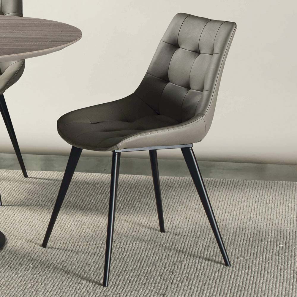 Dieser Stuhl zeichnet sich durch schwarz lackierte Metallbeine und einen mit Kunstleder in Schlammtaubengrau oder Titangrau bezogenen Sitz aus und ist mit einer feinen Capitonnè-Verarbeitung verziert, die ihm einen Hauch von Raffinesse und Stil verleiht.