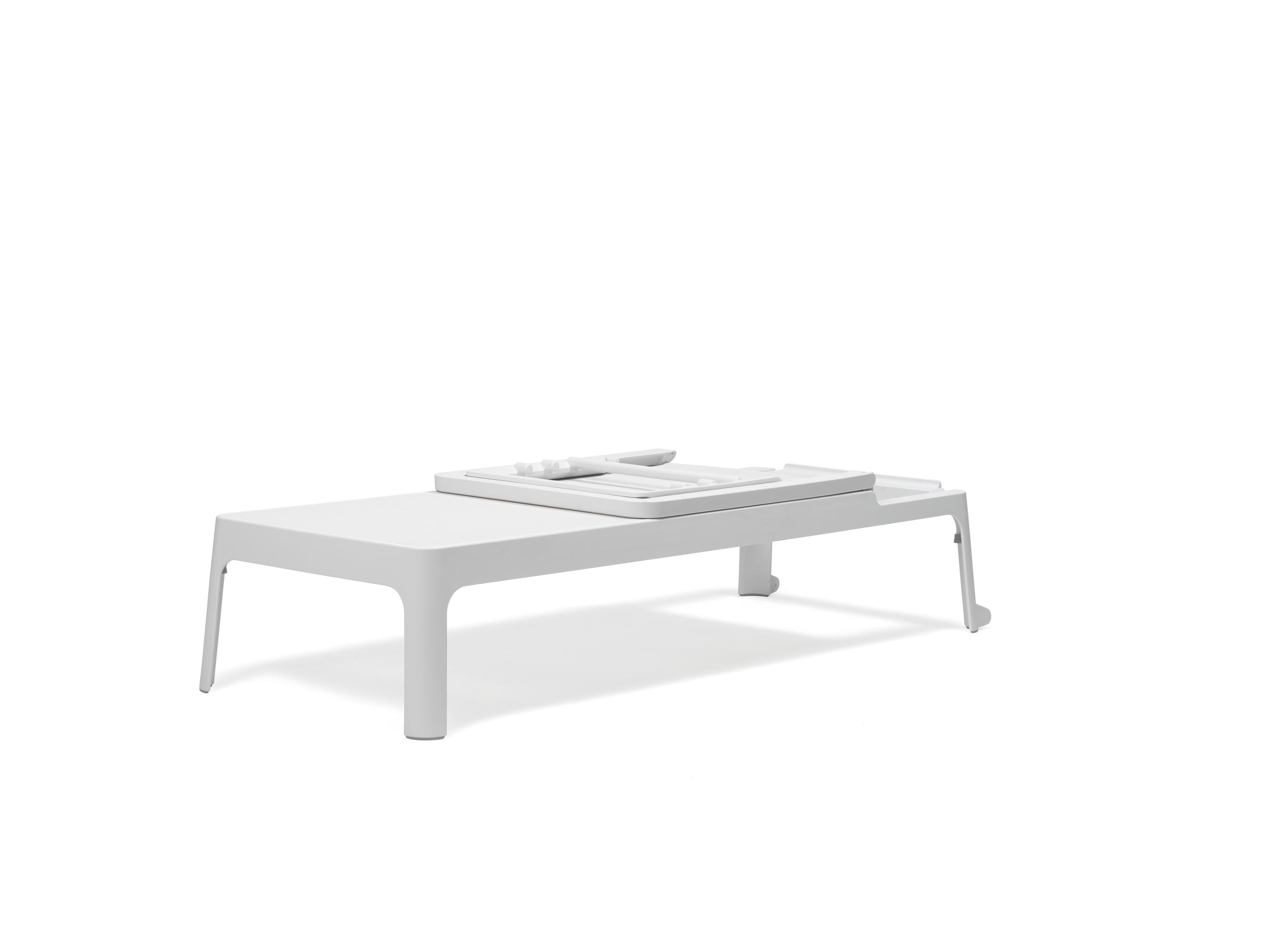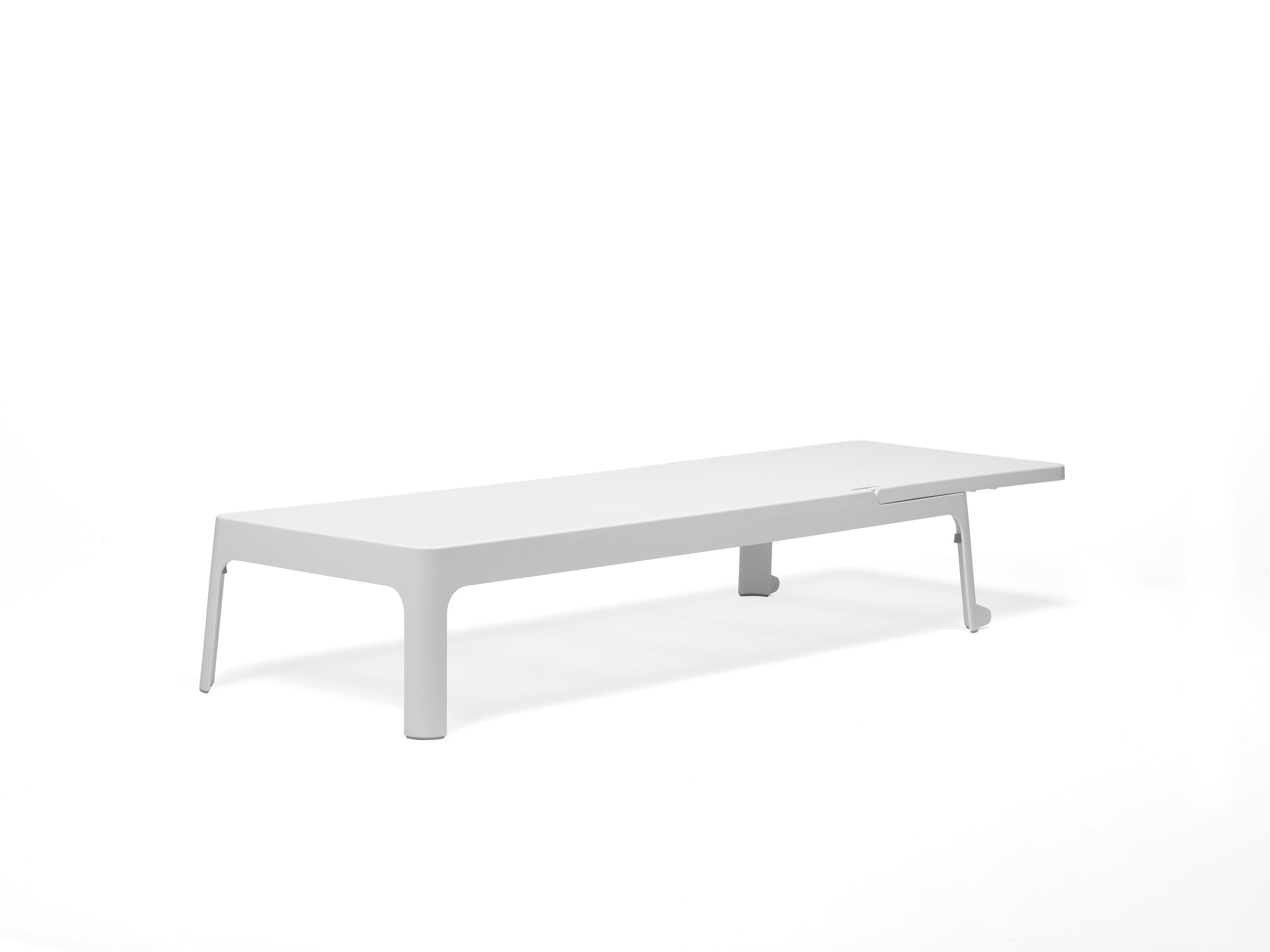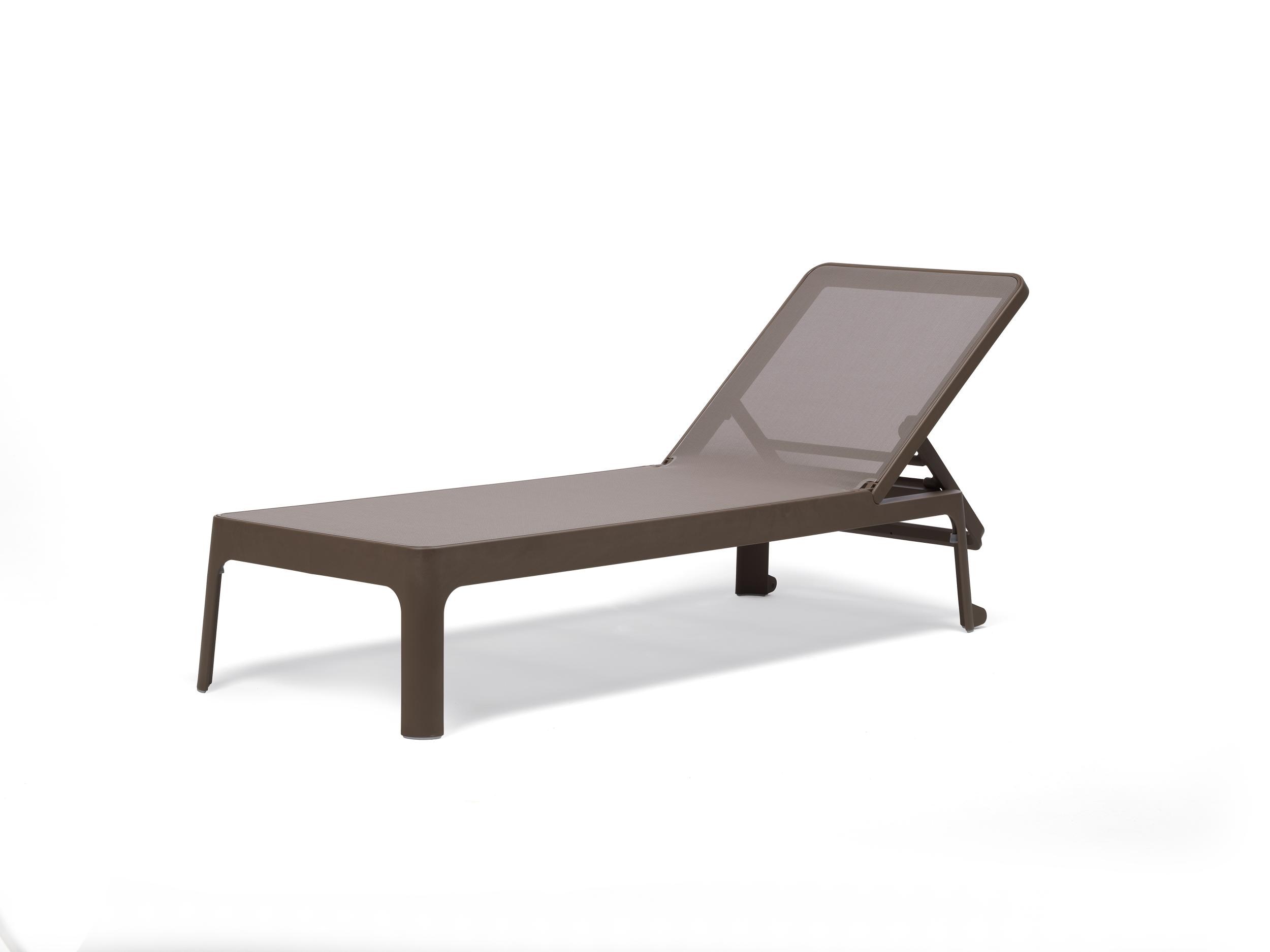 Diese Sonnenliege kommt ohne Armlehnen aus, ist leicht stapelbar und besteht aus einer Struktur aus UV-behandeltem und durchgefärbtem Fiberglas-Polypropylen mit matter Oberfläche.
