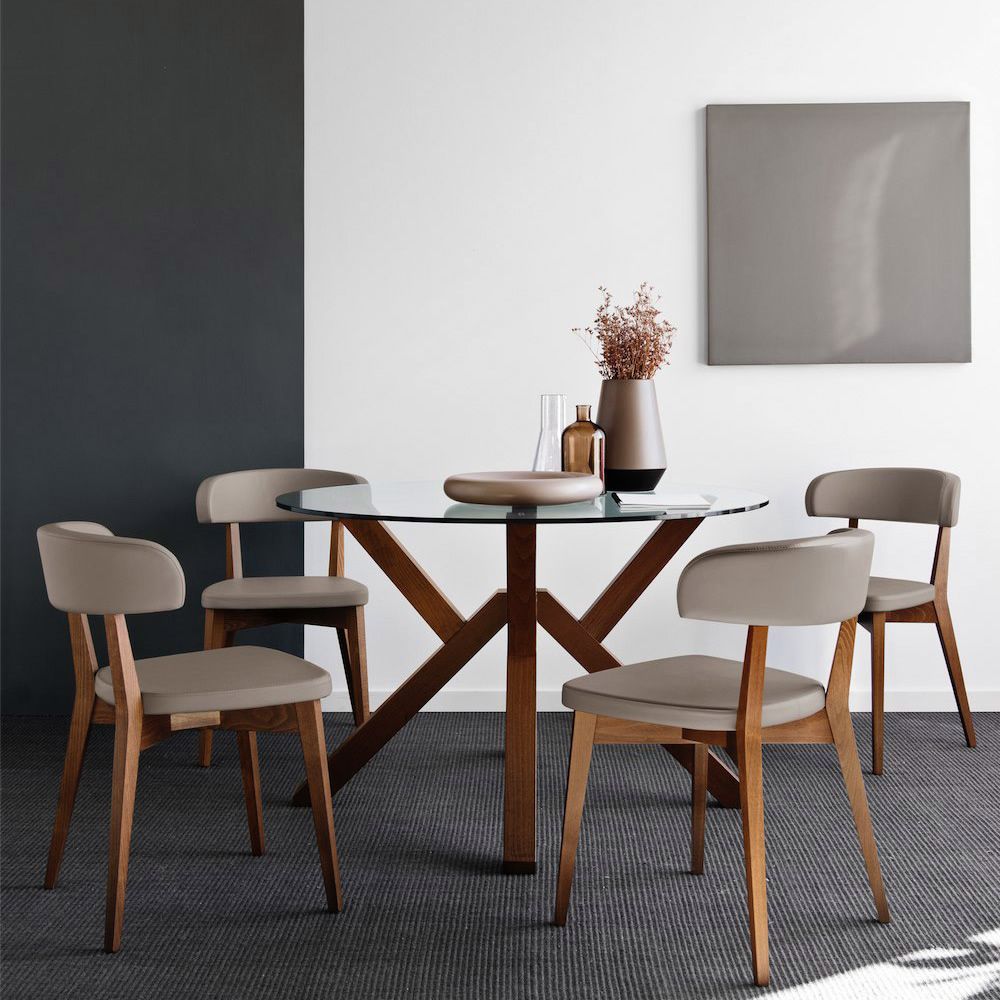 Stuhl Modell SIREN mit nordischem Design, Holzstruktur und breiter, bequemer Sitzfläche. Sowohl die umhüllende Rückenlehne als auch die breite Sitzfläche sind gepolstert. Die Polsterung ist in verschiedenen Stoffen und Farben erhältlich, ebenso wie die Oberflächen der Holzstruktur, die eine Vielzahl von Kombinationen ermöglichen, um jedem Bedarf gerecht zu werden.