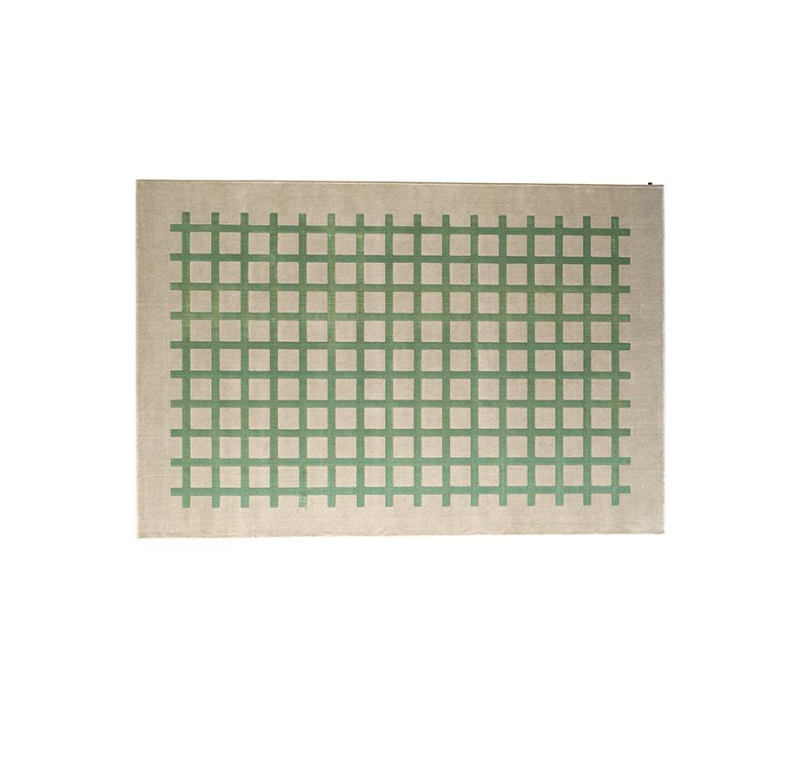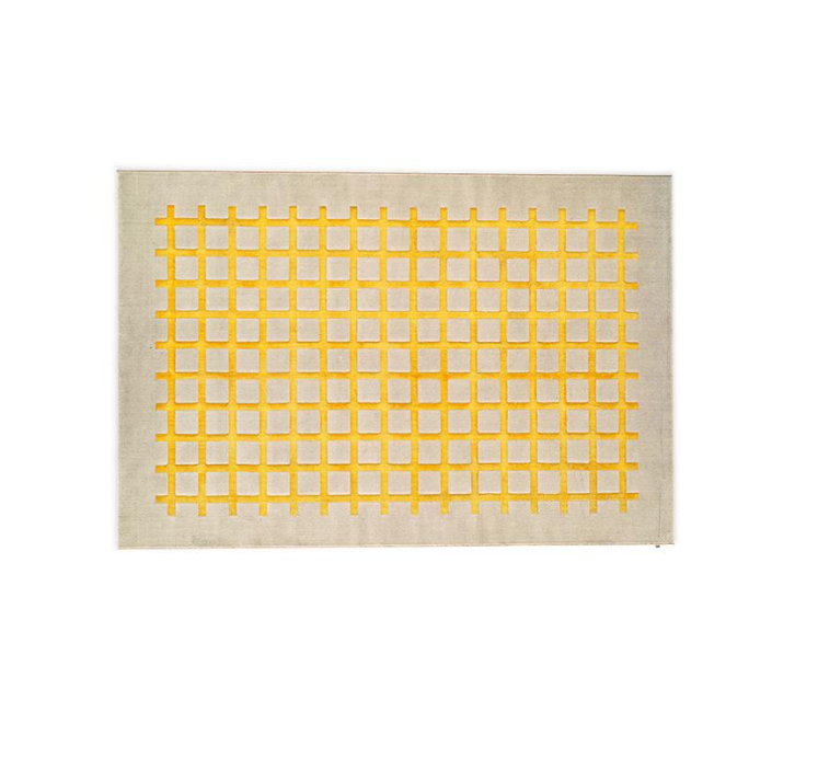 Er verfügt über ein Netz aus Linien, die ein orthogonales Gitter bilden: Erhältlich in den Farben Zitrone, Thymian und Safran, die der beigen Basis des Teppichs einen Hauch von Lebendigkeit verleihen.