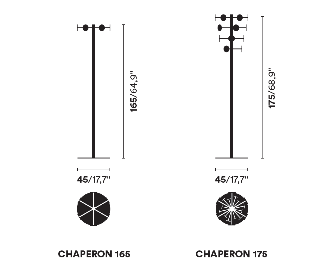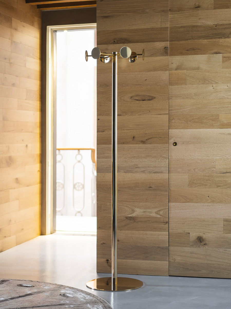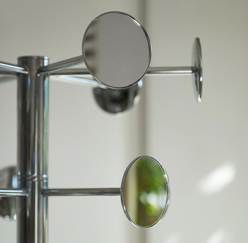 Chaperon ist ein Kleiderbügel, entworfen von Bruno Rainaldi für Opinion Ciatti. Garderobenständer mit drehbarer Krone, einzeln (6 Spiegel) H168 oder vier Elemente (18 Spiegel) H178. In den Ausführungen: Chrom mit Silberspiegel, Gold mit Goldspiegel.