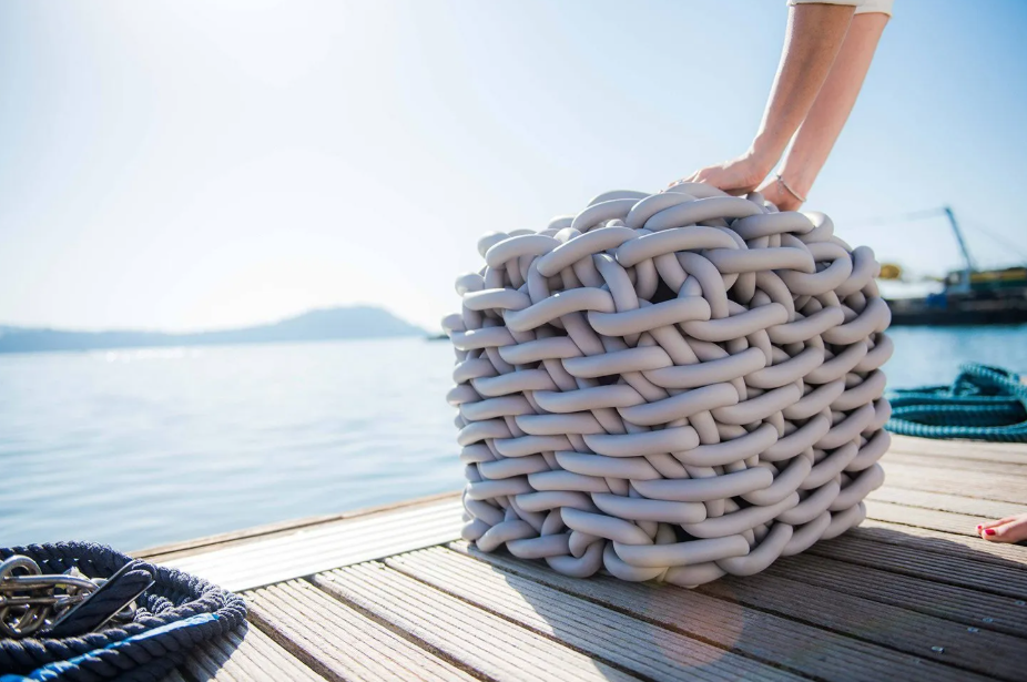 Gehäkelte Poufs aus gewebtem Gummifaden vereinen raffiniertes Design, Komfort und Nachhaltigkeit in einzigartigen handgefertigten Stücken.