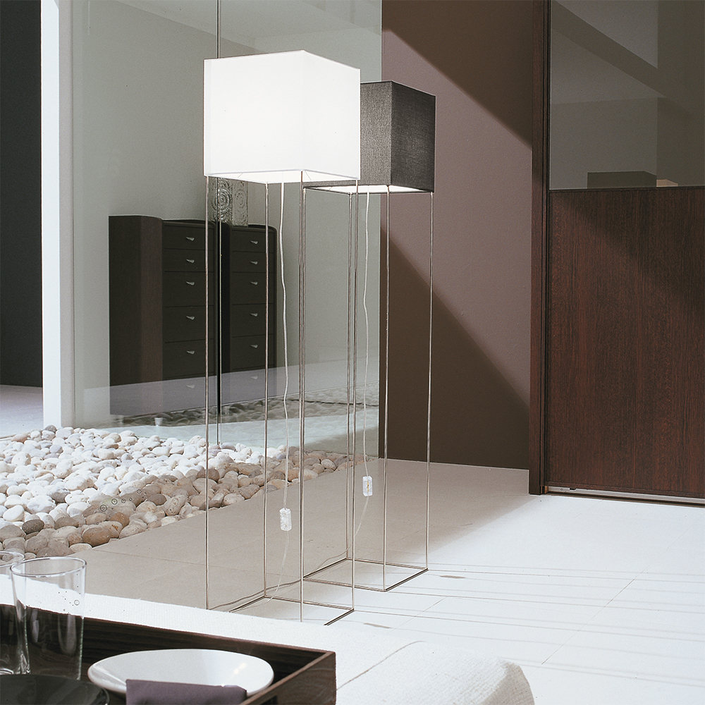Stehlampe, Stofflampenschirm, Stahldrahtstruktur.